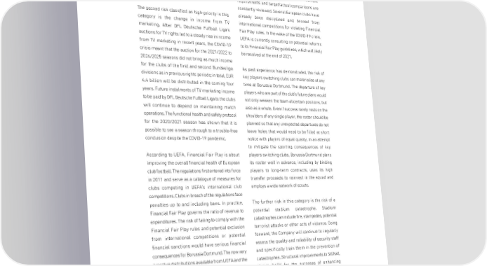 GROUP MANAGEMENT REPORT trouble-free season. The 2020/2021 season was UEFA competitions underscore the importance of completed without major scheduling issues thanks both qualifying and obtaining the requisite licences to the systematic implementation of DFL's health for international club competitions. To minimise this and safety protocol – even if the majority of matches risk therefore, compliance with the relevant were played behind closed doors. requirements and target/actual comparisons are constantly reviewed. Several European clubs have The second risk classified as high-priority in this already been disciplined and banned from category is the change in income from TV international competitions for violating Financial marketing. After DFL Deutsche Fußball Liga's Fair Play rules. In the wake of the COVID-19 crisis, auctions for TV rights led to a steady rise in income UEFA is currently consulting on potential reforms from TV marketing in recent years, the COVID-19 to its Financial Fair Play guidelines, which will likely crisis meant that the auction for the 2021/2022 to be resolved at the end of 2021. 2024/2025 seasons did not bring as much income for the clubs of the first and second Bundesliga As past experience has demonstrated, the risk of divisions as in previous rights periods; in total, EUR key players switching clubs can materialise at any 4.4 billion will be distributed in the coming four time at Borussia Dortmund. The departure of key years. Future instalments of TV marketing income players who are part of the club's future plans would to be paid by DFL Deutsche Fußball Liga to the clubs not only weaken the team at certain positions, but will continue to depend on maintaining match also as a whole. Even if success rarely rests on the operations. The functional health and safety protocol shoulders of any single player, the roster should be for the 2020/2021 season has shown that it is planned so that any unexpected departures do not possible to see a season through to a trouble-free leave holes that would need to be filled at short conclusion despite the COVID-19 pandemic. notice with players of equal quality. In an attempt to mitigate the sporting consequences of key According to UEFA, Financial Fair Play is about players switching clubs, Borussia Dortmund plans improving the overall financial health of European its roster well in advance, including by binding club football. The regulations first entered into force players to long-term contracts, uses its high in 2011 and serve as a catalogue of measures for transfer proceeds to reinvest in the squad and clubs competing in UEFA's international club employs a wide network of scouts. competitions. Clubs in breach of the regulations face penalties up to and including bans. In practice, The further risk in this category is the risk of a Financial Fair Play governs the ratio of revenue to potential stadium catastrophe. Stadium expenditures. The risk of failing to comply with the catastrophes can include fire, stampedes, potential Financial Fair Play rules and potential exclusion terrorist attacks or other acts of violence. Going from international competitions or potential forward, the Company will continue to regularly financial sanctions would have serious financial assess the quality and reliability of security staff consequences for Borussia Dortmund. The now very and specifically train them in the prevention of lucrative distributions available from UEFA and the catastrophes. Structural improvements to SIGNAL international prestige derived from taking part in IDUNA PARK for the purposes of enhancing 161