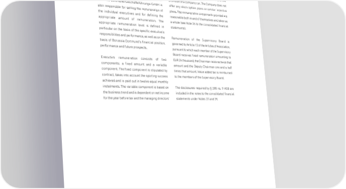 BORUSSIA DORTMUNDGmbH & Co. Kommanditgesellschaft auf Aktien, Dortmund REMUNERATION REPORT The structure of the management remuneration remuneration. Any additional non-cash or ancillary system is defined and regularly reviewed by the benefits granted relate primarily to insurance Executive Committee of the Advisory Board. The benefits at standard market conditions and the Executive Committee of the Advisory Board of provision of a company car. The Company does not Borussia Dortmund Geschäftsführungs-GmbH is offer any stock option plans or similar incentive also responsible for setting the remuneration of plans. The remuneration components provided are the individual executives and for defining the reasonable both in and of themselves and taken as appropriate amount of remuneration. The a whole (see Note 36 to the consolidated financial appropriate remuneration level is defined in statements). particular on the basis of the specific executive's responsibilities and performance, as well as on the Remuneration of the Supervisory Board is basis of Borussia Dortmund's financial position, governed by Article 13 of the Articles of Association, performance and future prospects. pursuant to which each member of the Supervisory Board receives fixed remuneration amounting to Executive remuneration consists of two EUR 24 thousand; the Chairman receives twice that components: a fixed amount and a variable amount and the Deputy Chairman one and a half component. The fixed component is stipulated by times that amount. Value added tax is reimbursed contract, takes into account the sporting success to the members of the Supervisory Board. achieved and is paid out in twelve equal monthly instalments. The variable component is based on The disclosures required by § 285 no. 9 HGB are the business trend and is dependent on net income included in the notes to the consolidated financial for the year before tax and the managing directors' statements under Notes 37 and 39. 152