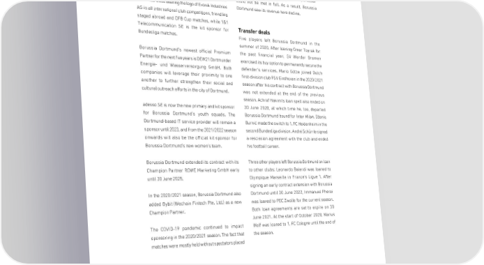 GROUP MANAGEMENT REPORT DEVELOPMENT OF THE MARKET AND COMPETITIVE ENVIRONMENT Sponsorships restrictions on match-day advertising and the Since the beginning of the 2020/2021 season, contractual claims of hospitality clients in particular Borussia Dortmund has had two kit sponsors. The could not be met in full. As a result, Borussia team wears kits bearing the logo of Evonik Industries Dortmund saw its revenue here decline. AG in all international club competitions, friendlies staged abroad and DFB Cup matches, while 1&1 Telecommunication SE is the kit sponsor for Transfer deals Bundesliga matches. Five players left Borussia Dortmund in the summer of 2020. After loaning Ömer Toprak for Borussia Dortmund's newest official Premium the past financial year, SV Werder Bremen Partner for the next five years is DEW21 Dortmunder exercised its buy option to permanently secure the Energie- und Wasserversorgung GmbH. Both defender's services. Mario Götze joined Dutch companies will leverage their proximity to one first-division club PSV Eindhoven in the 2020/2021 another to further strengthen their social and season after his contract with Borussia Dortmund cultural outreach efforts in the city of Dortmund. was not extended at the end of the previous season. Achraf Hakimi's loan spell also ended on adesso SE is now the new primary and kit sponsor 30 June 2020, at which time he, too, departed for Borussia Dortmund's youth squads. The Borussia Dortmund bound for Inter Milan. Dženis Dortmund-based IT service provider will remain a Burnić made the switch to 1. FC Heidenheim in the sponsor until 2023, and from the 2021/2022 season second Bundesliga division. André Schürrle signed onwards will also be the official kit sponsor for a rescission agreement with the club and ended Borussia Dortmund's new women's team. his football career. Borussia Dortmund extended its contract with its Three other players left Borussia Dortmund on loan Champion Partner ROWE Marketing GmbH early to other clubs: Leonardo Balerdi was loaned to until 30 June 2025. Olympique Marseille in France's Ligue 1. After signing an early contract extension with Borussia In the 2020/2021 season, Borussia Dortmund also Dortmund until 30 June 2022, Immanuel Pherai added Bybit (Wechain Fintech Pte. Ltd.) as a new was loaned to PEC Zwolle for the current season. Champion Partner. Both loan agreements are set to expire on 30 June 2021. At the start of October 2020, Marius The COVID-19 pandemic continued to impact Wolf was loaned to 1. FC Cologne until the end of sponsoring in the 2020/2021 season. The fact that the season. matches were mostly held without spectators placed 1st match day UCL 5th match day 20 October 2020 24 October 2020 Lazio Rom - BVB 3:1 BVB - FC Schalke 3:0 123 123
