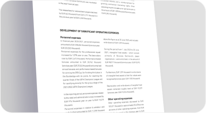 BORUSSIA DORTMUNDGmbH & Co. Kommanditgesellschaft auf Aktien, Dortmund from running courses (either national or Other operating income decreased by EUR 1,771 international) for months. A further reason for the thousand year on year to EUR 7,327 thousand. As decline in income was the fact that this year's DFL in the previous year, this included primarily income Super Cup was held in Munich. Moreover, unlike from provisions, insurance reimbursements, in the previous year, no (four-part) documentary unclaimed refunds and a reimbursement for series about Borussia Dortmund was marketed granting contractual marketing rights. Other in the past financial year. operating income includes prior-period income in the amount of EUR 1,898 thousand (previous year: The release fees for national team players declined EUR 5,382 thousand). by EUR 443 thousand from EUR 2,711 thousand in the previous year to EUR 2,268 thousand. DEVELOPMENT OF SIGNIFICANT OPERATING EXPENSES Personnel expenses above the figure as at 30 June 2020 and included In financial year 2020/2021, personnel expenses write-downs of EUR 1,591 thousand. amounted to EUR 205,604 thousand (previous year: EUR 203,523 thousand). During the period from 1 July 2020 to 30 June Personnel expenses for the professional squad 2021, intangible fixed assets – which consist increased by 1.07% year on year. The base salary primarily of Borussia Dortmund's player rose by EUR 2,472 thousand. Performance-based registrations – were amortised in the amount of bonuses amounted to EUR 28,742 thousand EUR 98,017 thousand (previous year: EUR 93,093 (previous year: EUR 29,363 thousand) and comprised thousand). annual bonuses and performance-based bonuses for winning the DFB Cup, for finishing third place in Furthermore, EUR 1,591 thousand in write-downs the Bundesliga with 64 points, for reaching the of intangible fixed assets to their fair values were quarter-finals of the UEFA Champions League and recognised (previous year: EUR 1,930 thousand). for qualifying directly for the group stage of the 2021/2022 UEFA Champions League. Depreciation and write-downs of tangible fixed assets remained roughly level at EUR 10,529 In the reporting period, personnel expenses related (previous year: EUR 10,524 thousand). to the retail and administration areas increased by EUR 976 thousand year on year to EUR 19,279 Other operating expenses thousand. Other operating expenses decreased by EUR Personnel expenses in relation to amateur and 101,811 thousand or approximately 52.62% across youth football amounted to EUR 11,398 thousand all items of other operating expenses, from EUR during the current 2020/2021 financial year 193,474 thousand in the previous year to EUR (previous year: EUR 12,144 thousand). 91,663 thousand in the reporting period. Depreciation, amortisation and The largest decrease under this item was seen in write-downs transfer deals, which fell by EUR 70,493 thousand Depreciation, amortisation and write-downs to EUR 9,565 thousand. By contrast to the previous amounted to EUR 110,137 thousand during the year, during which transfer deals resulted in the reporting period. This was EUR 4,590 thousand carrying amounts for the players Maximilian Philipp, 58