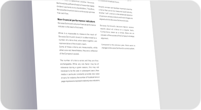BORUSSIA DORTMUNDGmbH & Co. Kommanditgesellschaft auf Aktien, Dortmund indicator for the club. In light of steadily growing Measurable criteria include, for example, the transfer sums, free cash flow is thus becoming number of season tickets sold, attendance figures increasingly important. Furthermore, it is an and television broadcast hours. indicator used to determine whether Borussia Dortmund has sufficient funds to finance the steady Awards, surveys and studies represent possible dividend payments to its shareholders. Therefore, criteria that cannot be measured quantitatively. Borussia Dortmund strives to continuously optimise Another "soft" criterion is the deliberate selection free cash flow. of sponsors whose products and brand images are aligned with the Borussia Dortmund brand. Non-financial performance indicators Borussia Dortmund's only non-financial performance Borussia Dortmund's decision-makers receive indicator is the reach of its brand. reports about all criteria on a regular basis. Furthermore, taken as a whole, these are an While it is impossible to measure the reach of indicator of the success of the Company's strategic Borussia Dortmund's brand, it is determined by a alignment. number of criteria that, when taken together, are representative of the brand's reach. Compared to the previous year, there were no Some of these criteria are measureable, while changes to Borussia Dortmund's control system. others are not. Nevertheless, they are a reflection of the Company's appeal. The number of criteria varies and they are thus exchangeable. While any one factor may be of relevance during a given season, this may not necessarily be the case in subsequent years. New media in particular constantly provides new value drivers: for instance, the number of Facebook fans or page impressions represent relatively new indicators. 36