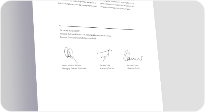 ANNUAL FINANCIAL STATEMENTS for the financial year from 1 July 2020 to 30 June 2021 RESPONSIBILITY STATEMENT To the best of our knowledge, and in accordance includes a fair review of the development and with the applicable reporting principles, the annual performance of the business and the position of financial statements give a true and fair view of the the Company, together with a description of the assets, liabilities, financial position and profit or principal opportunities and risks associated with loss of the Company, and the management report the expected development of the Company. Dortmund, 9 August 2021 Borussia Dortmund GmbH & Co. Kommanditgesellschaft auf Aktien Borussia Dortmund Geschäftsführungs-GmbH Hans-Joachim Watzke Thomas Treß Carsten Cramer Managing Director (Chairman) Managing Director Managing Director 117