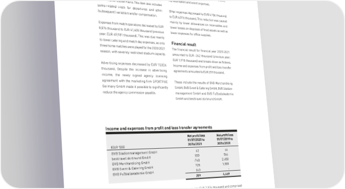 MANAGEMENT REPORTLAGEBERICHT Administrative expenses decreased during the Abdou Diallo, Alexander Isak, Julian Weigl, Paco Alcácer, Jacob Bruun Larsen and Sebastian Rode financial year ended by EUR 2,279 thousand to EUR being derecognised, the only carrying amounts 22,815 thousand. A slight increase in IT expenses derecognised this financial year were for the players was offset by significantly lower travel, Ömer Toprak and Dženis Burnić as well as for the representation and event expenses. former trainer Lucien Favre. This item also includes sales-related costs for departures and other Other expenses decreased by EUR 4,106 thousand (subsequent) variable transfer compensation. to EUR 4,816 thousand. This reduction was caused mainly by lower allowances on receivables and Expenses from match operations decreased by EUR lower losses on disposals of fixed assets as well as 8,576 thousand to EUR 41,405 thousand (previous lower expenses for office supplies. year: EUR 49,981 thousand). This was due mainly to lower catering and match day expenses, as only Financial result three home matches were played for the 2020/2021 The financial result for financial year 2020/2021 season, with severely restricted stadium capacity. amounted to EUR -262 thousand (previous year: EUR 1,915 thousand) and breaks down as follows: Advertising expenses decreased by EUR 15,826 Income and expenses from profit and loss transfer thousand. Despite the increase in advertising agreements amounted to EUR 259 thousand. income, the newly signed agency licensing agreement with the marketing firm SPORTFIVE These include the results of BVB Merchandising Germany GmbH made it possible to significantly GmbH, BVB Event & Catering GmbH, BVB Stadion- reduce the agency commission payable. management GmbH and BVB Fußballakademie GmbH and besttravel dortmund GmbH. Income and expenses from profit and loss transfer agreements Net profit/loss Net profit/loss 01/07/2020 to 01/07/2019 to 30/06/2021 30/06/2020 (EUR '000) BVB Stadionmanagement GmbH 42 64 besttravel dortmund GmbH 100 566 BVB Merchandising GmbH -748 2,458 BVB Event & Catering GmbH 725 1,581 BVB Fußballakademie GmbH 140 - 259 4,669 Furthermore, interest income of EUR 121 thousand amounted to EUR 2,934 thousand and comprised was recognised and related to entirely to mainly EUR 1,323 thousand in discounting effects compounding. and EUR 1,452 thousand in financing charges. Interest expenses amounted to EUR 642 thousand and comprised mainly financing charges of EUR 554 Tax on income of EUR 342 thousand were reported thousand and discounting effects of EUR 40 in the 2020/2021 financial year (previous year: thousand. In the previous year, interest expenses had EUR -50 thousand). 59