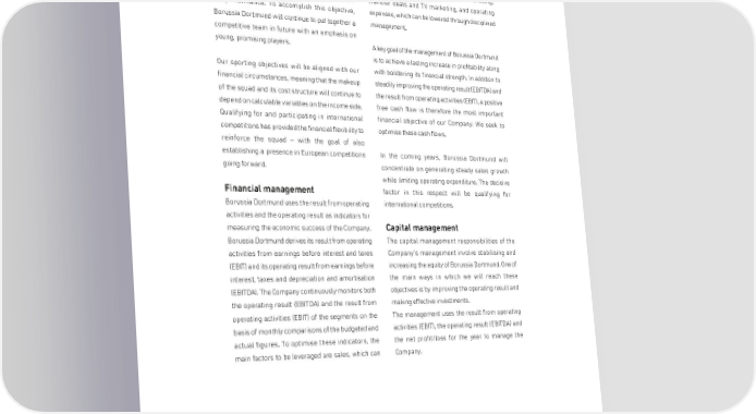 MANAGEMENT REPORT INTERNAL MANAGEMENT AND CONTROL SYSTEM Sports management be additionally improved in the major sales Going forward, we will continue to focus on categories of match operations, advertising, achieving success on the pitch under a budget tuned transfer deals and TV marketing, and operating for performance. To accomplish this objective, expenses, which can be lowered through disciplined Borussia Dortmund will continue to put together a management. competitive team in future with an emphasis on young, promising players. A key goal of the management of Borussia Dortmund is to achieve a lasting increase in profitability along Our sporting objectives will be aligned with our with bolstering its financial strength. In addition to financial circumstances, meaning that the makeup steadily improving the operating result (EBITDA) and of the squad and its cost structure will continue to the result from operating activities (EBIT), a positive depend on calculable variables on the income side. free cash flow is therefore the most important Qualifying for and participating in international financial objective of our Company. We seek to competitions has provided the financial flexibility to optimise these cash flows. reinforce the squad – with the goal of also establishing a presence in European competitions In the coming years, Borussia Dortmund will going forward. concentrate on generating steady sales growth while limiting operating expenditure. The decisive Financial management factor in this respect will be qualifying for Borussia Dortmund uses the result from operating international competitions. activities and the operating result as indicators for measuring the economic success of the Company. Capital management Borussia Dortmund derives its result from operating The capital management responsibilities of the activities from earnings before interest and taxes Company's management involve stabilising and (EBIT) and its operating result from earnings before increasing the equity of Borussia Dortmund. One of interest, taxes and depreciation and amortisation the main ways in which we will reach these (EBITDA). The Company continuously monitors both objectives is by improving the operating result and the operating result (EBITDA) and the result from making effective investments. operating activities (EBIT) of the segments on the The management uses the result from operating basis of monthly comparisons of the budgeted and activities (EBIT), the operating result (EBITDA) and actual figures. To optimise these indicators, the the net profit/loss for the year to manage the main factors to be leveraged are sales, which can Company. 45