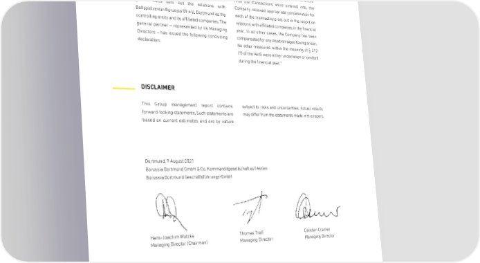 GROUP MANAGEMENT REPORT STATEMENT BY THE GENERAL PARTNER ON RELATIONS WITH AFFILIATED COMPANIES The Dependent Company Report prepared by "Based on the circumstances known to us at the Borussia Dortmund GmbH & Co. KGaA pursuant to time the transactions were entered into, the § 312 AktG sets out the relations with Company received appropriate consideration for Ballspielverein Borussia 09 e.V. Dortmund as the each of the transactions set out in the report on controlling entity and its affiliated companies. The relations with affiliated companies in the financial general partner – represented by its Managing year. In all other cases, the Company has been Directors – has issued the following concluding compensated for any disadvantages having arisen. declaration: No other measures within the meaning of § 312 (1) of the AktG were either undertaken or omitted during the financial year." DISCLAIMER This Group management report contains subject to risks and uncertainties. Actual results forward-looking statements. Such statements are may differ from the statements made in this report. based on current estimates and are by nature Dortmund, 9 August 2021 Borussia Dortmund GmbH & Co. Kommanditgesellschaft auf Aktien Borussia Dortmund Geschäftsführungs-GmbH Hans-Joachim Watzke Thomas Treß Carsten Cramer Managing Director (Chairman) Managing Director Managing Director 173
