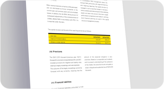 BORUSSIA DORTMUNDGmbH & Co. Kommanditgesellschaft auf Aktien, Dortmund Reserves Capital management Capital reserves consist exclusively of transfers in The objective of capital management is to ensure respect of premiums on the issue of new shares the Group's long-term ability to function on a going after deducting the net costs of the placement and concern basis and to generate appropriate returns the Company's share of revenues from the sale of for shareholders. Debt management steers the treasury shares. raising of debt, particularly with regard to financing with matching maturities. The capital structure is Other revenue reserves comprise profits generated managed in such a way that changes in macroeco- and not distributed by Group companies in the nomic conditions and risks arising from the underlying current year and previous years and accumulated assets are taken into account. Short-term target- losses. In addition, the net effect, taking account of performance comparisons and medium- and long- subsequent adjustments, of the remeasurement of term financial planning are used in the capital SIGNAL IDUNA PARK in accordance with IFRS 1.16 structure management process. is reported under this item. The capital structure at the end of the reporting period was as follows: EUR '000 30/06/2021 30/06/2020 Equity of shareholders 232,637 305,447 Share in total capital 51.64 % 58.97 % (10) Provisions The EUR 2,333 thousand (previous year: EUR 0 amount of the expected obligation is also thousand) in provisions recognised as at 30 June 2021 uncertain. Based on comparable past incidents included provisions for litigation and liability risks and its present understanding of the substance relating to legal proceedings, and was expensed. of the matter, Borussia Dortmund anticipates a The outcome of the legal proceedings cannot be value in dispute and a potential loss of EUR 2,333 forecast with any certainty, meaning that the thousand. (11) Financial liabilities Current financial liabilities amounted to EUR 56,900 thousand as at the end of the reporting period (previous year: EUR 8,031 thousand). As in the previous year, this related to an overdraft facility that has been utilised. 204