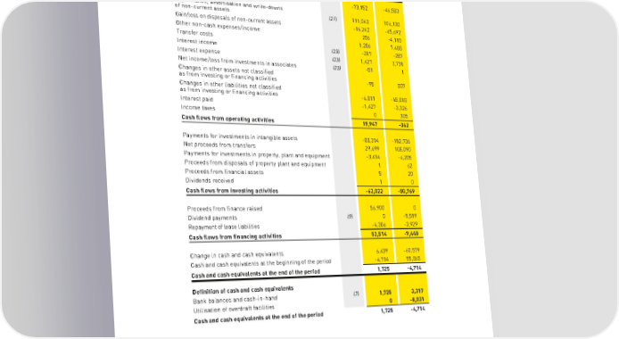BORUSSIA DORTMUNDGmbH & Co. Kommanditgesellschaft auf Aktien, Dortmund CONSOLIDATED STATEMENT OF CASH FLOWS of Borussia Dortmund GmbH & Co. Kommanditgesellschaft auf Aktien, Dortmund EUR '000 Note 2020/2021 2019/2020 Profit before income taxes -73,152 -46,583 Depreciation, amortisation and write-downs of non-current assets (21) 111,043 106,130 Gain/loss on disposals of non-current assets -16,242 -45,692 Other non-cash expenses/income 286 -4,118 Transfer costs 1,286 7,488 Interest income (23) -287 -287 Interest expense (23) 1,427 3,731 Net income/loss from investments in associates (23) -81 1 Changes in other assets not classified as from investing or financing activities -95 807 Changes in other liabilities not classified as from investing or financing activities -6,811 -18,818 Interest paid -1,427 -3,326 Income taxes 0 305 Cash flows from operating activities 15,947 -362 Payments for investments in intangible assets -88,314 -152,736 Net proceeds from transfers 29,699 108,090 Payments for investments in property, plant and equipment -3,414 -6,205 Proceeds from disposals of property plant and equipment 1 62 Proceeds from financial assets 5 20 Dividends received 1 0 Cash flows from investing activities -62,022 -50,769 Proceeds from finance raised 56,900 0 Dividend payments (9) 0 -5,519 Repayment of lease liabilities -4,386 -3,929 Cash flows from financing activities 52,514 -9,448 Change in cash and cash equivalents 6,439 -60,579 Cash and cash equivalents at the beginning of the period -4,714 55,865 Cash and cash equivalents at the end of the period 1,725 -4,714 Definition of cash and cash equivalents Bank balances and cash-in-hand (7) 1,725 3,317 Utilisation of overdraft facilities 0 -8,031 Cash and cash equivalents at the end of the period 1,725 -4,714 178