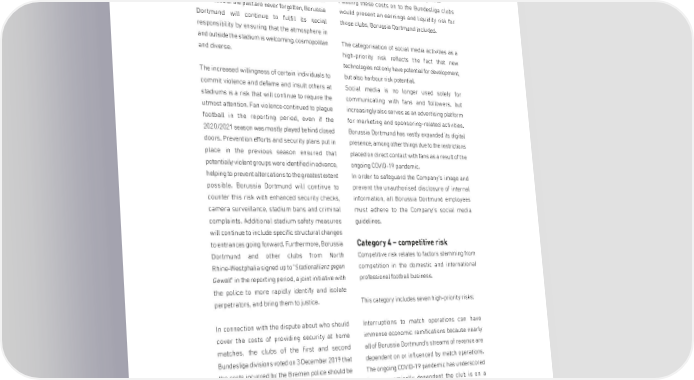 BORUSSIA DORTMUNDGmbH & Co. Kommanditgesellschaft auf Aktien, Dortmund disciplinary action, acting in concert with a broad resolved that SV Werder Bremen could defer a network of cooperation partners. By clearly partial amount of 50% until a final ruling on the legal speaking out against racism and discrimination as dispute was issued by the Federal Constitutional well as by working to combat right-wing attitudes, Court, and to reject a fund model of any kind. anti-Semitism and hate speech and to ensure that Passing these costs on to the Bundesliga clubs the lessons of the past are never forgotten, Borussia would present an earnings and liquidity risk for Dortmund will continue to fulfil its social those clubs, Borussia Dortmund included. responsibility by ensuring that the atmosphere in and outside the stadium is welcoming, cosmopolitan The categorisation of social media activities as a and diverse. high-priority risk reflects the fact that new technologies not only have potential for development, The increased willingness of certain individuals to but also harbour risk potential. commit violence and defame and insult others at Social media is no longer used solely for stadiums is a risk that will continue to require the communicating with fans and followers, but utmost attention. Fan violence continued to plague increasingly also serves as an advertising platform football in the reporting period, even if the for marketing and sponsoring-related activities. 2020/2021 season was mostly played behind closed Borussia Dortmund has vastly expanded its digital doors. Prevention efforts and security plans put in presence, among other things due to the restrictions place in the previous season ensured that placed on direct contact with fans as a result of the potentially violent groups were identified in advance, ongoing COVID-19 pandemic. helping to prevent altercations to the greatest extent In order to safeguard the Company's image and possible. Borussia Dortmund will continue to prevent the unauthorised disclosure of internal counter this risk with enhanced security checks, information, all Borussia Dortmund employees camera surveillance, stadium bans and criminal must adhere to the Company's social media complaints. Additional stadium safety measures guidelines. will continue to include specific structural changes to entrances going forward. Furthermore, Borussia Category 4 – competitive risk Dortmund and other clubs from North Competitive risk relates to factors stemming from Rhine-Westphalia signed up to "Stadionallianz gegen competition in the domestic and international Gewalt" in the reporting period, a joint initiative with professional football business. the police to more rapidly identify and isolate perpetrators, and bring them to justice. This category includes seven high-priority risks: In connection with the dispute about who should Interruptions to match operations can have cover the costs of providing security at home immense economic ramifications because nearly matches, the clubs of the first and second all of Borussia Dortmund's streams of revenue are Bundesliga divisions voted on 3 December 2019 that dependent on or influenced by match operations. the costs incurred by the Bremen police should be The ongoing COVID-19 pandemic has underscored borne in full by SV Werder Bremen. The clubs also how economically dependent the club is on a 160