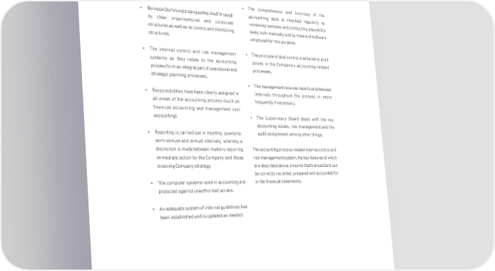 GROUP MANAGEMENT REPORT THE INTERNAL CONTROL AND RISK MANAGEMENT SYSTEM AS IT RELATES TO THE ACCOUNTING PROCESS The key features of the accounting process-related • The departments involved in the accounting internal control and risk management system process fulfil quantitative and qualitative employed by Borussia Dortmund can be described requirements. as follows: • The completeness and accuracy of the • Borussia Dortmund distinguishes itself through accounting data is checked regularly by its clear organisational and corporate reviewing samples and conducting plausibility structures as well as its control and monitoring tests, both manually and by means of software structures. employed for this purpose. • The internal control and risk management • The principle of dual control is adhered to at all systems as they relate to the accounting points in the Company's accounting-related process form an integral part of operational and processes. strategic planning processes. • The management receives reports at scheduled • Responsibilities have been clearly assigned in intervals throughout the process or more all areas of the accounting process (such as frequently if necessary. financial accounting and management cost accounting). • The Supervisory Board deals with the key accounting issues, risk management and the • Reporting is carried out in monthly, quarterly, audit assignment, among other things. semi-annual and annual intervals, whereby a distinction is made between matters requiring The accounting process-related internal control and immediate action by the Company and those risk management system, the key features of which involving Company strategy. are described above, ensures that transactions can be correctly recorded, prepared and accounted for • The computer systems used in accounting are in the financial statements. protected against unauthorised access. • An adequate system of internal guidelines has been established and is updated as needed. 153
