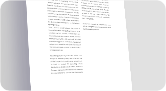 MANAGEMENT REPORT foundation for success. Investments, particularly activities and, if necessary, modify the strategy in the professional squad, are therefore a implemented as circumstances change. The key necessary prerequisite for achieving footballing figures for the sponsoring segment were already objectives such as qualifying for the UEFA budgeted for the coming years based on Champions League. However, in order to meet commitments from SIGNAL IDUNA Group (ending financial objectives, planned investments and 2026) and PUMA International Sports Marketing decisions must under certain circumstances be B.V. (ending 2028), the Company's chief partners, postponed to the extent these would only be as well as the two primary sponsors 1&1 possible by incurring new debt. Moreover, a player Telecommunication SE and Evonik Industries AG might be sold based on financial considerations (both ending 2025). in cases where this would not have happened had the decision been made purely on the basis of Income from international competitions is more sporting criteria. difficult to budget for, since it depends solely on the Thus a conflict arises between the pursuit of squad's footballing success. financial interests and sporting interests, i.e., a situation in which sporting considerations and financial considerations may be at odds with each other, particularly if the club continually falls short of its sporting goals. In such cases, management weighs the opportunities and risks to find a solution that does adequate justice to the Company's strategic objectives. Advertising plays a key role in this context. Over the years, advertising has grown to become one of the Company's largest income categories. In contrast to central TV marketing, where distribution is already clearly defined in advance, Company management is itself able to determine the requirements for and direction of sponsoring 47