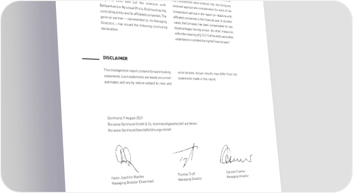 MANAGEMENT REPORT STATEMENT BY THE GENERAL PARTNER ON RELATIONS WITH AFFILIATED COMPANIES The Dependent Company Report prepared by "Based on the circumstances known to us at the time Borussia Dortmund GmbH & Co. KGaA pursuant the transactions were entered into, the Company to § 312 AktG sets out the relations with received appropriate consideration for each of the Ballspielverein Borussia 09 e.V. Dortmund as the transactions set out in the report on relations with controlling entity and its affiliated companies. The affiliated companies in the financial year. In all other general partner – represented by its Managing cases, the Company has been compensated for any Directors – has issued the following concluding disadvantages having arisen. No other measures declaration: within the meaning of § 312 (1) of the AktG were either undertaken or omitted during the financial year." DISCLAIMER This management report contains forward-looking uncertainties. Actual results may differ from the statements. Such statements are based on current statements made in this report. estimates and are by nature subject to risks and Dortmund, 9 August 2021 Borussia Dortmund GmbH & Co. Kommanditgesellschaft auf Aktien Borussia Dortmund Geschäftsführungs-GmbH Hans-Joachim Watzke Thomas Treß Carsten Cramer Managing Director (Chairman) Managing Director Managing Director 85