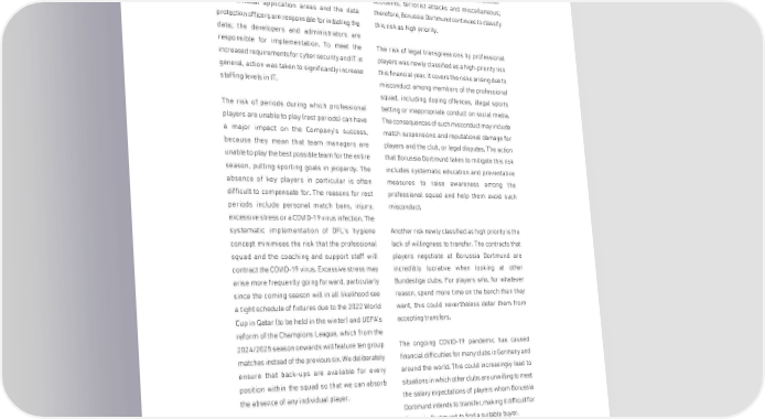 BORUSSIA DORTMUNDGmbH & Co. Kommanditgesellschaft auf Aktien, Dortmund access and manipulation of data. Confidential data human life takes precedence – that goes without that is processed, transferred or stored online must saying – but the economic consequences for the be encrypted. The data should remain encrypted businesses involved have also been immense. and protected even if the online application is There thus continues to be a risk of travel and other compromised. The IT security officers, the heads of accidents, terrorist attacks and miscellaneous; the individual application areas and the data therefore, Borussia Dortmund continues to classify protection officers are responsible for initiating the this risk as high priority. data; the developers and administrators are responsible for implementation. To meet the The risk of legal transgressions by professional increased requirements for cyber security and IT in players was newly classified as a high-priority risk general, action was taken to significantly increase this financial year. It covers the risks arising due to staffing levels in IT. misconduct among members of the professional squad, including doping offences, illegal sports The risk of periods during which professional betting or inappropriate conduct on social media. players are unable to play (rest periods) can have The consequences of such misconduct may include a major impact on the Company's success, match suspensions and reputational damage for because they mean that team managers are players and the club, or legal disputes. The action unable to play the best possible team for the entire that Borussia Dortmund takes to mitigate this risk season, putting sporting goals in jeopardy. The includes systematic education and preventative absence of key players in particular is often measures to raise awareness among the difficult to compensate for. The reasons for rest professional squad and help them avoid such periods include personal match bans, injury, misconduct. excessive stress or a COVID-19 virus infection. The systematic implementation of DFL's hygiene Another risk newly classified as high priority is the concept minimises the risk that the professional lack of willingness to transfer. The contracts that squad and the coaching and support staff will players negotiate at Borussia Dortmund are contract the COVID-19 virus. Excessive stress may incredibly lucrative when looking at other arise more frequently going forward, particularly Bundesliga clubs. For players who, for whatever since the coming season will in all likelihood see reason, spend more time on the bench than they a tight schedule of fixtures due to the 2022 World want, this could nevertheless deter them from Cup in Qatar (to be held in the winter) and UEFA's accepting transfers. reform of the Champions League, which from the 2024/2025 season onwards will feature ten group The ongoing COVID-19 pandemic has caused matches instead of the previous six. We deliberately financial difficulties for many clubs in Germany and ensure that back-ups are available for every around the world. This could increasingly lead to position within the squad so that we can absorb situations in which other clubs are unwilling to meet the absence of any individual player. the salary expectations of players whom Borussia Dortmund intends to transfer, making it difficult for The world of sport has witnessed a number of Borussia Dortmund to find a suitable buyer. terrible accidents in recent years. The tragic loss of 70