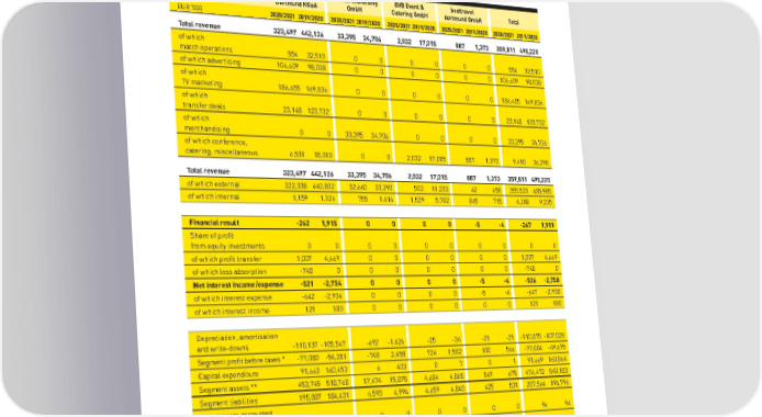 BORUSSIA DORTMUNDGmbH & Co. Kommanditgesellschaft auf Aktien, Dortmund OPERATING SEGMENTS Borussia BVB Merchandising BVB Event & besttravel Total Dortmund KGaA GmbH Catering GmbH dortmund GmbH EUR '000 2020/2021 2019/2020 2020/2021 2019/2020 2020/2021 2019/2020 2020/2021 2019/2020 2020/2021 2019/2020 Total revenue 323,497 442,126 33,395 34,706 2,032 17,015 887 1,373 359,811 495,220 of which match operations 554 32,510 0 0 0 0 0 0 554 32,510 of which advertising 106,609 98,038 0 0 0 0 0 0 106,609 98,038 of which TV marketing 186,655 169,836 0 0 0 0 0 0 186,655 169,836 of which transfer deals 23,148 123,732 0 0 0 0 0 0 23,148 123,732 of which merchandising 0 0 33,395 34,706 0 0 0 0 33,395 34,706 of which conference, catering, miscellaneous 6,531 18,010 0 0 2,032 17,015 887 1,373 9,450 36,398 Total revenue 323,497 442,126 33,395 34,706 2,032 17,015 887 1,373 359,811 495,220 of which external 322,338 440,802 32,640 33,292 503 11,233 42 658 355,523 485,985 of which internal 1,159 1,324 755 1,414 1,529 5,782 845 715 4,288 9,235 Financial result -262 1,915 0 0 0 0 -5 -4 -267 1,911 Share of profit from equity investments 0 0 0 0 0 0 0 0 0 0 of which profit transfer 1,007 4,669 0 0 0 0 0 0 1,007 4,669 of which loss absorption -748 0 0 0 0 0 0 0 -748 0 Net interest income/expense -521 -2,754 0 0 0 0 -5 -4 -526 -2,758 of which interest expense -642 -2,934 0 0 0 0 -5 -4 -647 -2,938 of which interest income 121 180 0 0 0 0 0 0 121 180 Depreciation, amortisation and write-downs -110,137 -105,547 -692 -1,426 -25 -34 -21 -21 -110,875 -107,028 Segment profit before taxes * -77,080 -54,281 -748 2,458 724 1,582 100 566 -77,004 -49,675 Capital expenditure 91,663 160,453 6 403 0 7 0 1 91,669 160,864 Segment assets ** 453,745 518,768 17,474 15,875 4,684 4,865 569 675 476,472 540,183 Segment liabilities 195,887 184,431 6,593 4,994 4,659 4,840 425 531 207,564 194,796 Investments accounted for using the equity method 96 96 0 0 0 0 0 0 96 96 Income from investments in associates 0 0 0 0 0 0 0 0 0 0 * Before profit or loss transfer. ** KGaA segment includes EUR 9,456 thousand (previous year: EUR 19,645 thousand) in assets held for sale. 194