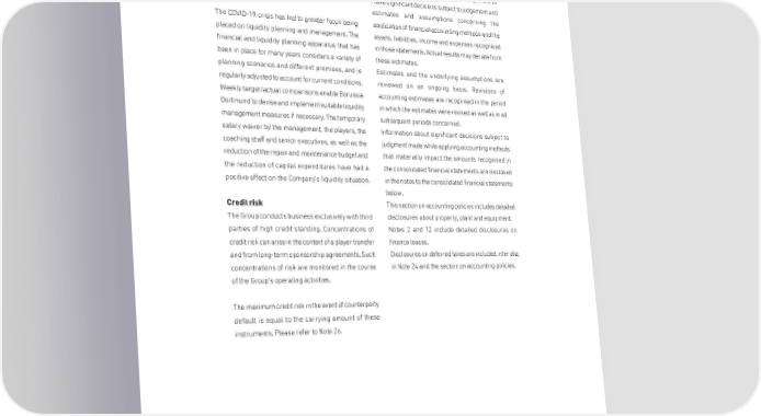 BORUSSIA DORTMUNDGmbH & Co. Kommanditgesellschaft auf Aktien, Dortmund The elements of financing falling due in the short Significant decisions subject term are subject to continuous monitoring on the to judgement and estimates basis of the relevant corporate planning. Please The preparation of consolidated financial statements refer to Note 30 for disclosures on the maturities in accordance with IFRSs requires management to of contractual cash flows. make significant decisions subject to judgement and estimates and assumptions concerning the The COVID-19 crisis has led to greater focus being application of financial accounting methods and the placed on liquidity planning and management. The assets, liabilities, income and expenses recognised financial and liquidity planning apparatus that has in those statements. Actual results may deviate from been in place for many years considers a variety of these estimates. planning scenarios and different premises, and is Estimates and the underlying assumptions are regularly adjusted to account for current conditions. reviewed on an ongoing basis. Revisions of Weekly target/actual comparisons enable Borussia accounting estimates are recognised in the period Dortmund to devise and implement suitable liquidity in which the estimates were revised as well as in all management measures if necessary. The temporary subsequent periods concerned. salary waiver by the management, the players, the Information about significant decisions subject to coaching staff and senior executives, as well as the judgment made while applying accounting methods reduction of the repair and maintenance budget and that materially impact the amounts recognised in the reduction of capital expenditures have had a the consolidated financial statements are disclosed positive effect on the Company's liquidity situation. in the notes to the consolidated financial statements below. Credit risk This section on accounting policies includes detailed The Group conducts business exclusively with third disclosures about property, plant and equipment. parties of high credit standing. Concentrations of Notes 2 and 12 include detailed disclosures on credit risk can arise in the context of a player transfer finance leases. and from long-term sponsorship agreements. Such Disclosures on deferred taxes are included, inter alia, concentrations of risk are monitored in the course in Note 24 and the section on accounting policies. of the Group's operating activities. The maximum credit risk in the event of counterparty default is equal to the carrying amount of these instruments. Please refer to Note 26. 192