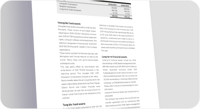 ANNUAL FINANCIAL STATEMENTS for the financial year from 1 July 2020 to 30 June 2021 NOTES TO THE BALANCE SHEET Fixed assets As at the balance sheet date, Borussia Dortmund's fixed assets break down as follows: EUR '000 30/06/2021 30/06/2020 Intangible fixed assets 204,003 248,948 Tangible fixed assets 182,725 190,769 Long-term financial assets 12,175 11,749 398,903 451,466 Intangible fixed assets Additions to tangible fixed assets amounted to Intangible fixed assets amounted to EUR 204,003 EUR 2,922 thousand in the financial year, EUR thousand. These consist of purchased player 2,987 thousand less than capital expenditures as registrations (EUR 203,067 thousand; previous at 30 June 2020. Due to the ongoing COVID-19 year: EUR 247,789 thousand), as well as trademark pandemic, investments were made primarily in rights, computer software and prepayments. The the Brackel training ground. Capital expenditures additions recognised in financial year 2020/2021 there amounted to EUR 2,170 thousand. Both the (EUR 58,738 thousand) related in full to player power plant and the sprinting hill were completed registrations. this year. These mainly resulted from the new signings Jude Bellingham and Thomas Meunier as well as the Long-term financial assets trainer Marco Rose and performance-based Long-term financial assets include the 100% subsequent costs. shareholdings in BVB Stadionmanagement GmbH, This was partly offset by amortisation and BVB Merchandising GmbH, BVB Event & Catering write-downs of EUR 99,608 thousand in the GmbH, besttravel dortmund GmbH, BVB reporting period. This included EUR 1,591 Fußballakademie GmbH (newly formed in June thousand in write-downs of assets to fair value. 2020) and BVB Asia Pacific Pte. Ltd., as well as the Due to transfer deals, the carrying amounts for the 33.33% shareholding in Orthomed Medizinisches players Mario Götze, André Schürrle, Ömer Toprak, Leistungs- und Rehabilitationszentrum GmbH. Dženis Burnić and Łukasz Piszczek were Please refer to the list of shareholdings for more derecognised, as was the carrying amount for information. trainer Lucien Favre due to the dissolution of his Long-term financial assets also include loans to contract. employees. The Company has entered into a profit and loss Tangible fixed assets transfer agreement with its subsidiaries BVB Tangible fixed assets amounted to EUR 182,725 Merchandising GmbH, BVB Stadionmanagement thousand as at 30 June 2021. That figure included GmbH, BVB Event & Catering GmbH and besttravel land and buildings amounting to EUR 167,784 dortmund GmbH. thousand, of which EUR 124,104 thousand was attributable to the stadium building. The development of gross fixed assets and of Tangible fixed assets also included EUR 7,505 accumulated depreciation and amortisation for the thousand in fixtures, operating and office individual items of fixed assets are shown in the equipment related to SIGNAL IDUNA PARK. following analysis pursuant to § 284 (3) HGB: 93