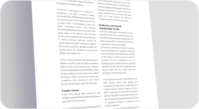 MANAGEMENT REPORT would come to an orderly close and the marketing In the previous financial year, the players Maximilian partners would pay the budgeted amounts in full Philipp transferred to FC Dynamo Moscow, Abdou and on time. Since the distribution amount Diallo to Paris Saint-Germain, Alexander Isak to Real fluctuated in the 2020/2021 reporting period, DFL Sociedad, Julian Weigl to Benfica Lisbon, Paco Deutsche Fußball Liga GmbH was ultimately forced Alcácer to Villarreal CF, Jacob Bruun Larsen to TSG to reduce the income with respect to the planned Hoffenheim, Sebastian Rode to Eintracht Frankfurt international TV marketing payouts. and Shinji Kagawa to Real Zaragoza. Furthermore, the players Dženis Burnić, Jeremy Toljan, Ömer Income from international TV marketing for Toprak, André Schürrle and Marius Wolf were competing in the UEFA Champions League loaned out. These transfers also generated amounted to EUR 78,698 thousand in the financial subsequent transfer proceeds and loan fees. year (previous year: EUR 67,420 thousand). The increase of EUR 11,278 thousand is due to the Conference, catering and higher performance bonus, since Borussia miscellaneous income Dortmund amassed four wins and one draw in the Conference, catering and miscellaneous income group stage. In the previous year, Borussia amounted to EUR 6,531 thousand (previous year: Dortmund only managed three wins and one draw. EUR 18,010 thousand) and also included sales from In addition, Borussia Dortmund reached the advance booking fees, rental and lease income and quarter-finals of the UEFA Champions League for release fees for national team players. the first time since 2017, although the team was Conference and catering income, which comprises knocked out of the competition following two income generated by the hospitality areas and defeats to Manchester City. events, decreased by EUR 2,067 thousand from EUR 2,258 thousand in the previous year to EUR 191 Unlike in the previous year, Borussia Dortmund thousand. The lack of spectators at 14 of 17 failed to win the DFL Super Cup, its first competitive Bundesliga home matches and fewer hospitality match of the current financial year. Borussia customers at the first three Bundesliga home Dortmund reached the final of the DFB Cup, where fixtures meant that only limited sales were the team chalked up a resounding victory against generated in the hospitality areas. RB Leipzig in Berlin. Income from domestic cup competitions thus amounted to EUR 10,131 In the reporting period from 1 July 2020 to 30 June thousand (previous year: EUR 4,729 thousand). 2021, advance booking fees, postage and miscellaneous income, which includes the Evonik Transfer income Football Academy, rental and lease income and Income from transfer deals declined by EUR BVB TV, decreased by EUR 8,969 thousand to 100,584 thousand to EUR 23,148 thousand (previous EUR4,072 thousand. This was due primarily to the year: EUR 123,732 thousand) lack of advance booking fees due to the restrictions on spectators imposed in response to the This resulted from the transfers of the players Ömer COVID-19 pandemic. Toprak to Werder Bremen and Dženis Burnić to 1. As well as the lack of advance booking fees for FC Heidenheim. In addition, Leonardo Balerdi was match day ticket sales, there was a shortfall in loaned to Olympique Marseille, Jeremy Toljan advance booking fees for season tickets after was loaned to U.S. Sassuolo and Sergio Gómez Borussia Dortmund decided as in the previous year was loaned to SD Huesca. Borussia Dortmund that it would initially suspend season ticket sales also generated subsequent transfer income. at the end of the season given the inability to Furthermore, Mario Götze left to join PSV Eindhoven predict how the pandemic would develop. on a free transfer. Likewise, the Football Academy was prevented 57