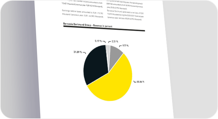 BORUSSIA DORTMUNDGmbH & Co. Kommanditgesellschaft auf Aktien, Dortmund RESULTS OF OPERATIONS During the reporting period (1 July 2020 to 30 June the result from operating activities (EBIT) amounted 2021), Borussia Dortmund generated revenue of EUR to EUR -72,093 thousand (previous year: EUR -43,138 334,171 thousand (previous year: EUR 370,196 thousand). thousand), EUR 36,025 thousand less than in the During the current reporting year, the operating result previous year. Net transfer income amounted to EUR (EBITDA) amounted to EUR 38,950 thousand (previous 15,401 thousand (previous year: EUR 40,160 thousand). year: EUR 62,992 thousand). Borussia Dortmund generated a net loss of EUR Earnings before taxes amounted to EUR -73,152 72,810 thousand during the 2020/2021 financial year thousand (previous year: EUR -46,583 thousand); (previous year: net loss of EUR 43,953 thousand). Borussia Dortmund Group– Revenue in percent 0.17 % 2.31 % 9.77 % 31.89 % 55.86 % Conference, catering, miscellaneous TV Marketing Match operations Merchandising Advertising Quarter final, first leg UCL 28th match day 6 April 2021 10 April 2021 Manchester City - BVB 2:1 VfB Stuttgart - BVB 2:3 140