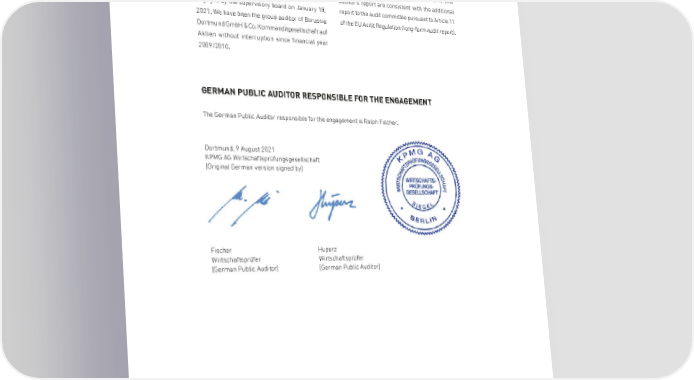 BORUSSIA DORTMUNDGmbH & Co. Kommanditgesellschaft auf Aktien, Dortmund FURTHER INFORMATION PURSUANT TO ARTICLE 10 OF THE EU AUDIT REGULATION We were elected as group auditor by the annual We declare that the opinions expressed in this general meeting on November 19, 2020. We were auditor's report are consistent with the additional engaged by the supervisory board on January 18, report to the audit committee pursuant to Article 11 2021. We have been the group auditor of Borussia of the EU Audit Regulation (long-form audit report). Dortmund GmbH & Co. Kommanditgesellschaft auf Aktien without interruption since financial year 2009/2010. GERMAN PUBLIC AUDITOR RESPONSIBLE FOR THE ENGAGEMENT The German Public Auditor responsible for the engagement is Ralph Fischer. Dortmund, 9 August 2021 KPMG AG Wirtschaftsprüfungsgesellschaft [Original German version signed by] Fischer Huperz Wirtschaftsprüfer Wirtschaftsprüfer [German Public Auditor] [German Public Auditor] 232