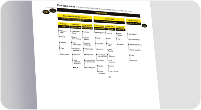 BORUSSIA DORTMUNDGmbH & Co. Kommanditgesellschaft auf Aktien, Dortmund Within Borussia Dortmund GmbH & Co. KGaA there "Human Resources", "Organisation", "Finance" and are seven independent functional areas below the "Legal & IR". The responsible employees and the management level, namely, "Sports", "Sales, functional organisational areas of which they are Marketing & Digitalisation", "Communications", in charge are shown in the chart below: Functional areas of Borussia Dortmund GmbH & Co. Kommanditgesellschaft auf Aktien, Dortmund STRATEGY MANAGEMENT CORPORATE & CULTURE SECURITY Hans-Joachim Watzke(Chairman) Thomas Treß Carsten Cramer CORPORATE STRATEGY, CORPORATE COMMUNICATIONS, SPORTS, FINANCE, ORGANISATION, LEGAL & IR SALES, MARKETING, DIGITALIZATION COMMUNICATIONS, HUMAN RESOURCES WOMEN’S FOOTBALL Michael Zorc Sascha Fligge Corinna Borgmann Dr. Christian Hockenjos Mark Stahlschmidt Dr. Robin Steden SPORT COMMUNICATIONS HUMAN RESOURCES ORGANISATION FINANCE LEGAL & IR Professional Communications Recruiting Match Organisation Accounting Investor Marketing & Brand Football Strategy Relations Scouting Corporate Employer Security Payroll Legal Digital, CRM & E-Business Communications Branding Amateurs Sport Onboarding Accreditation Financial Compliance International & New Business Communications &Offboarding Control Youth International HR Development Associations Financial Corporate Responsibility and National PR Reporting Youth Academy Publications HR Management Event Management Risk Ticketing – Match Operations Management Editing Occupational Safety Fan Services Equity Merchandising and Content & Health Protection Investments Management Reception Insurance BVB TV Fleet Management Property Event & Catering Management IT 13th match day DFB cup 2nd round 18 December 2020 22 December 2020 Union Berlin - BVB 2:1 Eintr. Braunschweig - BVB 0:2 130 130