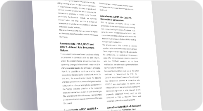 CONSOLIDATED FINANCIAL STATEMENTS for the period from 1 July 2020 to 30 June 2021 process that together significantly contribute to the The amendments did not have any material impact ability to create outputs. Furthermore, the definition on the consolidated financial statements of Borussia of outputs is narrowed by focusing on goods and Dortmund. services provided to customers and by removing the reference to an ability to reduce costs. The new Amendments to IFRS 16 – Covid-19- provisions furthermore include an optional Related Rent Concessions concentration test that permits a simplified IFRS 16 contains provisions relating to the assessment of whether an acquired set of activities presentation of changes in lease payments (including and assets is not a business. rent concessions) by the lessee. The lessee must The amendments did not have any material impact generally assess for each lease whether the rent on the consolidated financial statements of Borussia concessions granted constitute a modification of the Dortmund. lease and must remeasure the lease liability resulting from any such modifications. Amendment to IFRS 9, IAS 39 and The Amendment to IFRS 16 offers a practical IFRS 7 – Interest Rate Benchmark expedient in the event rent concessions are utilised. Reform This is subject to certain requirements and available These amendments were issued to address existing for a limited time. The expedient permits lessees to uncertainties in connection with the IBOR reform. account for rent concessions granted in connection Under the present hedge accounting rules, the with the COVID-19 pandemic not as lease upcoming changes in benchmark rates would in modifications but rather as though there had been many instances result in the termination of hedges. no modification to the lease. Now it is possible to continue existing hedge Borussia Dortmund has made use of the option accounting relationships for a transitional period. To enshrined in "Amendment to IFRS 16 – that end, the amendments provide for specific Covid-19-Related Rent Concessions" to not present mandatory exceptions to previous hedge accounting rent concessions granted in connection with rules, such as rules pertaining to the assessment of COVID-19 as a modification. The applied option the "highly probable" criterion in the context of relates solely to three properties leased by BVB expected transactions as part of cash flow hedges. Merchandising GmbH. In total, changes in rent The amendments did not have any material impact payments recognised through profit or loss on the consolidated financial statements of Borussia amounted to EUR 66 thousand. These were Dortmund. recognised under other operating income. Amendments to IAS 1 and IAS 8 – Amendments to IFRS 4 – Extension of Definition of Material the Temporary Exemption from The amendments create a uniform and more Applying IFRS 9 ("deferral of IFRS 9") consistent definition of materiality of information The Amendments to IFRS 4 are intended to address presented in financial statements in the IFRSs and the temporary accounting issues caused by the provide accompanying examples. In that difference in the dates of application of IFRS 9 connection, the definitions set out in the Conceptual Financial Instruments and the future IFRS 17 Framework, IAS 1, IAS 8 and IFRS Practice Insurance Contracts. In particular the temporary Statement 2 "Making Materiality Judgements" have exemption from IFRS 9 is extended until 2023 in order been aligned. to align the date of application of IFRS 9 with that of 181 181