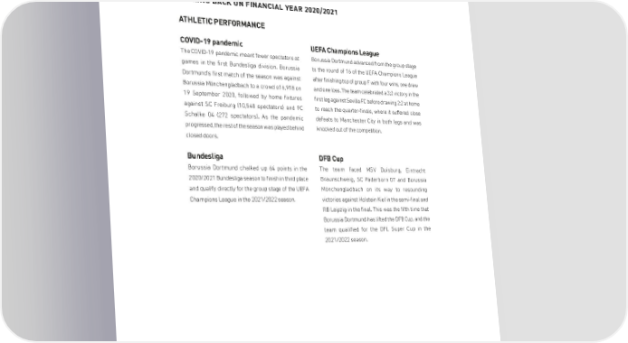 BORUSSIA DORTMUNDGmbH & Co. Kommanditgesellschaft auf Aktien, Dortmund MANAGEMENT REPORT Borussia Dortmund GmbH & Co. Kommanditgesellschaft auf Aktien, Dortmund for the 2020/2021 financial year (hereinafter "Borussia Dortmund" or "Borussia Dortmund GmbH & Co. KGaA") BUSINESS TREND LOOKING BACK ON FINANCIAL YEAR 2020/2021 ATHLETIC PERFORMANCE COVID-19 pandemic UEFA Champions League The COVID-19 pandemic meant fewer spectators at Borussia Dortmund advanced from the group stage games in the first Bundesliga division. Borussia to the round of 16 of the UEFA Champions League Dortmund's first match of the season was against after finishing top of group F with four wins, one draw Borussia Mönchengladbach to a crowd of 6,918 on and one loss. The team celebrated a 3:2 victory in the 19 September 2020, followed by home fixtures first leg against Sevilla FC before drawing 2:2 at home against SC Freiburg (10,548 spectators) and FC to reach the quarter-finals, where it suffered close Schalke 04 (272 spectators). As the pandemic defeats to Manchester City in both legs and was progressed, the rest of the season was played behind knocked out of the competition. closed doors. Bundesliga DFB Cup Borussia Dortmund chalked up 64 points in the The team faced MSV Duisburg, Eintracht 2020/2021 Bundesliga season to finish in third place Braunschweig, SC Paderborn 07 and Borussia and qualify directly for the group stage of the UEFA Mönchengladbach on its way to resounding Champions League in the 2021/2022 season. victories against Holstein Kiel in the semi-final and RB Leipzig in the final. This was the fifth time that Borussia Dortmund has lifted the DFB Cup, and the team qualified for the DFL Super Cup in the 2021/2022 season. 34