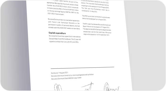 BORUSSIA DORTMUNDGmbH & Co. Kommanditgesellschaft auf Aktien, Dortmund Report on post-balance sheet date events Transfer deals Match operations Borussia Dortmund has reached an agreement with On 4 December 2020, the DFB Executive Committee top English club Manchester United regarding the adopted the new fixture calendar for the 2021/2022 transfer of player Jadon Sancho. As part of this season. This stipulated that Bundesliga matches agreement, Borussia Dortmund will receive a fixed would start on the weekend of 13 to 15 August 2021. transfer fee of EUR 85.0 million, which is expected The 34th and final Bundesliga match day is to have a positive effect of around EUR 56.0 million scheduled for 14 May 2022. on the key earnings figures (EBITDA, EBIT) for the 2021/2022 financial year. The DFB Cup will start with the first round one week before the Bundesliga from 6 August 2021. Borussia Dortmund has now reached an agreement with French club Olympique Marseille on the The DFL Super Cup between Borussia Dortmund and permanent transfer of Leonardo Balerdi, who had Bayern Munich will be played on 17 August 2021. already spent the 2020/2021 season on loan there. The dates for the UEFA Champions League have also already been set: the first match day of the group Capital expenditure stage will be played on 14/15 September 2021. Borussia Dortmund has signed Dutch international Donyell Malen from PSV Eindhoven. The 22-year-old signed a contract that runs until 30 June 2026. Dortmund, 9 August 2021 Borussia Dortmund GmbH & Co. Kommanditgesellschaft auf Aktien Borussia Dortmund Geschäftsführungs-GmbH Hans-Joachim Watzke Thomas Treß Carsten Cramer Managing Director (Chairman) Managing Director Managing Director 108 41009946 1376911
