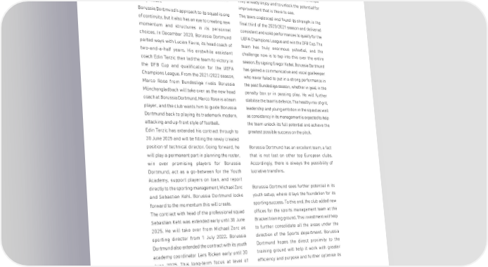 BORUSSIA DORTMUNDGmbH & Co. Kommanditgesellschaft auf Aktien, Dortmund OPPORTUNITIES By once again directly qualifying for the UEFA sporting management offers Borussia Dortmund Champions League, the club again has the a solid basis for planning and gives those in opportunity to consolidate its standing as one of positions of responsibility the opportunity to keep Europe's top teams and to once more share in the building on the strong and trusting relationships profits distributed for participating in the lucrative they already enjoy and to unlock the potential for competition. improvement that is there to see. Borussia Dortmund's approach to its squad is one The team coalesced and found its strength in the of continuity, but it also has an eye to creating new final third of the 2020/2021 season and delivered momentum and structures in its personnel consistent and solid performances to qualify for the choices. In December 2020, Borussia Dortmund UEFA Champions League and win the DFB Cup. The parted ways with Lucien Favre, its head coach of team has truly enormous potential, and the two-and-a-half years. His erstwhile assistant challenge now is to tap into this over the entire coach Edin Terzic then led the team to victory in season. By signing Gregor Kobel, Borussia Dortmund the DFB Cup and qualification for the UEFA has gained a communicative and vocal goalkeeper Champions League. From the 2021/2022 season, who never failed to put in a strong performance in Marco Rose from Bundesliga rivals Borussia the past Bundesliga season, whether in goal, in the Mönchengladbach will take over as the new head penalty box or in passing play. He will further coach at Borussia Dortmund. Marco Rose is a team stabilise the team's defence. The healthy mix of grit, player, and the club wants him to guide Borussia leadership and young ambition in the squad as well Dortmund back to playing its trademark modern, as consistency in its management is expected to help attacking and up-front style of football. the team unlock its full potential and achieve the Edin Terzic has extended his contract through to greatest possible success on the pitch. 30 June 2025 and will be filling the newly created position of technical director. Going forward, he Borussia Dortmund has an excellent team, a fact will play a permanent part in planning the roster, that is not lost on other top European clubs. win over promising players for Borussia Accordingly, there is always the possibility of Dortmund, act as a go-between for the Youth lucrative transfers. Academy, support players on loan, and report directly to the sporting management, Michael Zorc Borussia Dortmund sees further potential in its and Sebastian Kehl. Borussia Dortmund looks youth setup, where it lays the foundation for its forward to the momentum this will create. sporting success. To this end, the club added new The contract with head of the professional squad offices for the sports management team at the Sebastian Kehl was extended early until 30 June Brackel training ground. This investment will help 2025. He will take over from Michael Zorc as to further consolidate all the areas under the sporting director from 1 July 2022. Borussia direction of the Sports department. Borussia Dortmund also extended the contract with its youth Dortmund hopes the direct proximity to the academy coordinator Lars Ricken early until 30 training ground will help it work with greater June 2025. This long-term focus at level of efficiency and purpose and further optimise its 164