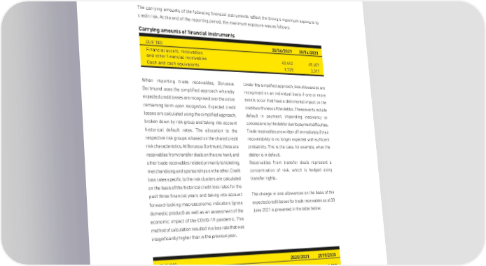 BORUSSIA DORTMUNDGmbH & Co. Kommanditgesellschaft auf Aktien, Dortmund OTHER DISCLOSURES FINANCIAL RISKS (26) Credit risk The carrying amounts of the following financial instruments reflect the Group's maximum exposure to credit risk. At the end of the reporting period, the maximum exposure was as follows: Carrying amounts of financial instruments EUR '000 30/06/2021 30/06/2020 Financial assets, receivables and other financial receivables 40,440 49,607 Cash and cash equivalents 1,725 3,317 When reporting trade receivables, Borussia Under the simplified approach, loss allowances are Dortmund uses the simplified approach whereby recognised on an individual basis if one or more expected credit losses are recognised over the entire events occur that have a detrimental impact on the remaining term upon recognition. Expected credit creditworthiness of the debtor. These events include losses are calculated using the simplified approach, default in payment, impending insolvency or broken down by risk group and taking into account concessions by the debtor due to payment difficulties. historical default rates. The allocation to the Trade receivables are written off immediately if their respective risk groups is based on the shared credit recoverability is no longer expected with sufficient risk characteristics. At Borussia Dortmund, these are probability. This is the case, for example, when the receivables from transfer deals on the one hand, and debtor is in default. other trade receivables related primarily to ticketing, Receivables from transfer deals represent a merchandising and sponsorships on the other. Credit concentration of risk, which is hedged using loss rates specific to the risk clusters are calculated transfer rights. on the basis of the historical credit loss rates for the past three financial years and taking into account The change in loss allowances on the basis of the forward-looking macroeconomic indicators (gross expected credit losses for trade receivables as at 30 domestic product) as well as an assessment of the June 2021 is presented in the table below: economic impact of the COVID-19 pandemic. This method of calculation resulted in a loss rate that was insignificantly higher than in the previous year. EUR '000 2020/2021 2019/2020 Loss allowances as at 1 July in accordance with IFRS 9 3,982 1,852 Transfers recognised in profit or loss 497 2,552 Reversals recognised in profit or loss -626 -427 Items recognised outside profit or loss -2,675 0 Loss allowances in accordance with IFRS 9 4 5 Loss allowances as at 30 June 1,182 3,982 212