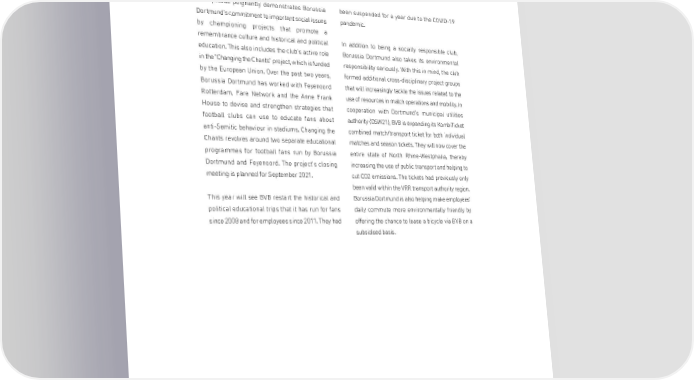 BORUSSIA DORTMUNDGmbH & Co. Kommanditgesellschaft auf Aktien, Dortmund The episode poignantly demonstrates Borussia been suspended for a year due to the COVID-19 Dortmund's commitment to important social issues pandemic. by championing projects that promote a remembrance culture and historical and political In addition to being a socially responsible club, education. This also includes the club's active role Borussia Dortmund also takes its environmental in the "Changing the Chants" project, which is funded responsibility seriously. With this in mind, the club by the European Union. Over the past two years, formed additional cross-disciplinary project groups Borussia Dortmund has worked with Feyenoord that will increasingly tackle the issues related to the Rotterdam, Fare Network and the Anne Frank use of resources in match operations and mobility. In House to devise and strengthen strategies that cooperation with Dortmund's municipal utilities football clubs can use to educate fans about authority (DSW21), BVB is expanding its KombiTicket anti-Semitic behaviour in stadiums. Changing the combined match/transport ticket for both individual Chants revolves around two separate educational matches and season tickets. They will now cover the programmes for football fans run by Borussia entire state of North Rhine-Westphalia, thereby Dortmund and Feyenoord. The project's closing increasing the use of public transport and helping to meeting is planned for September 2021. cut CO2 emissions. The tickets had previously only been valid within the VRR transport authority region. This year will see BVB restart the historical and Borussia Dortmund is also helping make employees' political educational trips that it has run for fans daily commute more environmentally friendly by since 2008 and for employees since 2011. They had offering the chance to lease a bicycle via BVB on a subsidised basis. 52