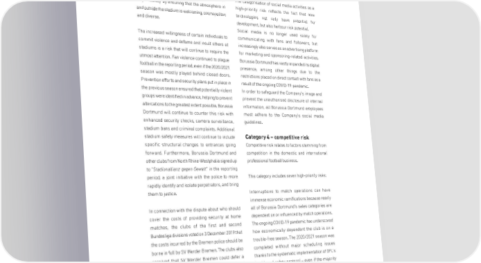 BORUSSIA DORTMUNDGmbH & Co. Kommanditgesellschaft auf Aktien, Dortmund speaking out against racism and discrimination as Passing these costs on to the Bundesliga clubs well as by working to combat right-wing attitudes, would present an earnings and liquidity risk for anti-Semitism and hate speech and to ensure that those clubs, Borussia Dortmund included. the lessons of the past are never forgotten, Borussia Dortmund will continue to fulfil its social The categorisation of social media activities as a responsibility by ensuring that the atmosphere in high-priority risk reflects the fact that new and outside the stadium is welcoming, cosmopolitan technologies not only have potential for and diverse. development, but also harbour risk potential. Social media is no longer used solely for The increased willingness of certain individuals to communicating with fans and followers, but commit violence and defame and insult others at increasingly also serves as an advertising platform stadiums is a risk that will continue to require the for marketing and sponsoring-related activities. utmost attention. Fan violence continued to plague Borussia Dortmund has vastly expanded its digital football in the reporting period, even if the 2020/2021 presence, among other things due to the season was mostly played behind closed doors. restrictions placed on direct contact with fans as a Prevention efforts and security plans put in place in result of the ongoing COVID-19 pandemic. the previous season ensured that potentially violent In order to safeguard the Company's image and groups were identified in advance, helping to prevent prevent the unauthorised disclosure of internal altercations to the greatest extent possible. Borussia information, all Borussia Dortmund employees Dortmund will continue to counter this risk with must adhere to the Company's social media enhanced security checks, camera surveillance, guidelines. stadium bans and criminal complaints. Additional stadium safety measures will continue to include Category 4 – competitive risk specific structural changes to entrances going Competitive risk relates to factors stemming from forward. Furthermore, Borussia Dortmund and competition in the domestic and international other clubs from North Rhine-Westphalia signed up professional football business. to "Stadionallianz gegen Gewalt" in the reporting period, a joint initiative with the police to more This category includes seven high-priority risks: rapidly identify and isolate perpetrators, and bring them to justice. Interruptions to match operations can have immense economic ramifications because nearly In connection with the dispute about who should all of Borussia Dortmund's sales categories are cover the costs of providing security at home dependent on or influenced by match operations. matches, the clubs of the first and second The ongoing COVID-19 pandemic has underscored Bundesliga divisions voted on 3 December 2019 that how economically dependent the club is on a the costs incurred by the Bremen police should be trouble-free season. The 2020/2021 season was borne in full by SV Werder Bremen. The clubs also completed without major scheduling issues resolved that SV Werder Bremen could defer a thanks to the systematic implementation of DFL's partial amount of 50% until a final ruling on the legal health and safety protocol – even if the majority dispute was issued by the Federal Constitutional of matches were played behind closed doors. Court, and to reject a fund model of any kind. 72