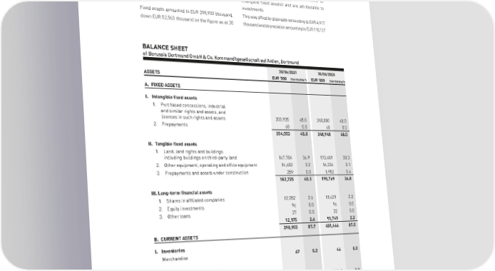 BORUSSIA DORTMUNDGmbH & Co. Kommanditgesellschaft auf Aktien, Dortmund ANALYSIS OF CAPITAL STRUCTURE DEVELOPMENT AND PERFORMANCE OF THE BUSINESS As at 30 June 2021, total assets amounted to EUR June 2020. The additions amounted to EUR 62,091 453,745 thousand, representing a decrease of thousand (of which EUR 58,738 thousand to EUR 65,023 thousand as compared to 30 June 2020. intangible fixed assets) and are attributable to investments. Fixed assets amounted to EUR 398,903 thousand, This was offset by disposals amounting to EUR 4,517 down EUR 52,563 thousand on the figure as at 30 thousand and depreciation amounting to EUR 110,137 BALANCE SHEET of Borussia Dortmund GmbH & Co. Kommanditgesellschaft auf Aktien, Dortmund 30/06/2021 30/06/2020 ASSETS EUR '000 Shareholding % EUR '000 Shareholding % A. FIXED ASSETS I. Intangible fixed assets 1. Purchased concessions, industrial and similar rights and assets, and licences in such rights and assets 203,935 45.0 248,880 48.0 2. Prepayments 68 0.0 68 0.0 204,003 45.0 248,948 48.0 II. Tangible fixed assets 1. Land, land rights and buildings including buildings on third-party land 167,784 36.9 172,481 33.3 2. Other equipment, operating and office equipment 14,682 3.2 16,336 3.1 3. Prepayments and assets under construction 259 0.0 1,952 0.4 182,725 40.1 190,769 36.8 III. Long-term financial assets 1. Shares in affiliated companies 12,052 2.6 11,621 2.2 2. Equity investments 96 0.0 96 0.0 3. Other loans 27 0.0 32 0.0 12,175 2.6 11,749 2.2 398,903 87.7 451,466 87.0 B. CURRENT ASSETS I. Inventories Merchandise 67 0.2 46 0.0 II. Receivables and other assets 1. Trade receivables 32,740 7.2 45,563 8.8 2. Receivables from affiliated companies 1,570 0.3 1,511 0.3 3. Other assets 2,303 0.5 1,516 0.3 36,613 8.0 48,590 9.4 III. Cash-in-hand, bank balances 3,466 0.7 3,157 0.6 40,146 8.9 51,793 10.0 C. PREPAID EXPENSES 14,696 3.2 15,509 3.0 453,745 100.0 518,768 100.0 60
