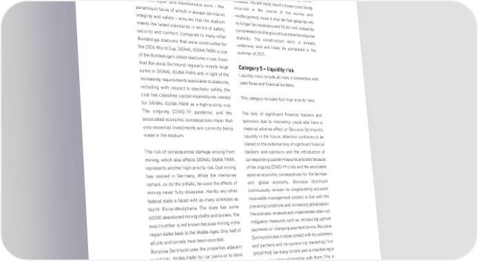 BORUSSIA DORTMUNDGmbH & Co. Kommanditgesellschaft auf Aktien, Dortmund Borussia Dortmund uses the summer break each which is why sinkholes and similar subsidence year to invest in SIGNAL IDUNA PARK as well as cannot be ruled out. An additional expert opinion for construction work and refurbishments. The has been obtained, which states that there is stadium has been expanded three times since merely a risk of the subsoil subsiding, not of opening in 1974 with a capacity of 54,000. The collapse. This will likely result in lower costs being continual repair and maintenance work – the incurred in the course of the survey and paramount focus of which is always structural reinforcement, since it may be that geogrids will integrity and safety – ensures that the stadium no longer be necessary and fill dirt will instead be meets the latest standards in terms of safety, compressed into the ground to achieve the requisite security and comfort. Compared to many other stability. The construction work is already Bundesliga stadiums that were constructed for underway and will likely be completed in the the 2006 World Cup, SIGNAL IDUNA PARK is one summer of 2021. of the Bundesliga's oldest stadiums in use. Given that Borussia Dortmund regularly invests large Category 5 – liquidity risk sums in SIGNAL IDUNA PARK and in light of the Liquidity risks include all risks in connection with increasing requirements applicable to stadiums, cash flows and financial burdens. including with respect to spectator safety, the club has classified capital expenditures needed This category includes four high-priority risks: for SIGNAL IDUNA PARK as a high-priority risk. The ongoing COVID-19 pandemic and the The loss of significant financial backers and associated economic consequences mean that sponsors due to insolvency could also have a only essential investments are currently being material adverse effect on Borussia Dortmund's made in the stadium. liquidity in the future. Attention continues to be placed on the potential loss of significant financial The risk of consequential damage arising from backers and sponsors and the introduction of mining, which also affects SIGNAL IDUNA PARK, corresponding countermeasures precisely because represents another high-priority risk. Coal mining of the ongoing COVID-19 crisis and the associated has ceased in Germany. While the memories adverse economic consequences for the German remain, so do the pitfalls, because the effects of and global economy. Borussia Dortmund mining never fully disappear. Hardly any other continuously revises its longstanding accounts federal state is faced with as many sinkholes as receivable management system in line with the North Rhine-Westphalia. The state has some prevailing conditions and increasing globalisation. 60,000 abandoned mining shafts and tunnels. The The club also reviewed and implemented other risk exact number is not known because mining in the mitigation measures such as introducing upfront region dates back to the Middle Ages. Only half of payments or changing payment terms. Borussia all pits and tunnels have been recorded. Dortmund is also in close contact with its customers Borussia Dortmund uses the properties adjacent and partners and its sponsoring marketing firm to SIGNAL IDUNA PARK for car parks or to store SPORTFIVE Germany GmbH, and is maintaining a products and equipment needed for match close and trusting relationship with them. This is operations. The southwest container and logistics also evident from the individual solutions that area is located on land with uncertain topography, Borussia Dortmund has found with its partners to 74