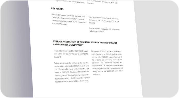 GROUP MANAGEMENT REPORT ANALYSIS OF LIQUIDITY As at 30 June 2021, Borussia Dortmund held drawn down as at the end of the reporting period. unrestricted cash funds of EUR 1,725 thousand. Borussia Dortmund also had access to an Cash flows from operating activities amounted to additional EUR 120,000 thousand in overdraft EUR 15,947 thousand (previous year: EUR -362 facilities, of which EUR 56,900 thousand had been thousand). NET ASSETS Borussia Dortmund's total assets decreased from Trade receivables and other financial receivables EUR 517,967 thousand to EUR 450,519 thousand. decreased by EUR 8,872 thousand to EUR 40,328 Fixed assets declined by EUR 45,740 thousand to thousand. EUR 377,317 thousand. Prepaid expenses decreased by EUR 817 thousand to EUR 14,802 thousand. OVERALL ASSESSMENT OF FINANCIAL POSITION AND PERFORMANCE AND BUSINESS DEVELOPMENT Borussia Dortmund ended the 2020/2021 financial The ongoing COVID-19 pandemic continued to year with a net loss for the year of EUR 72,810 weigh heavily on profitability and ultimately thousand. earnings in the 2020/2021 season. The effects of the pandemic are particularly clear in match Taking into account the net loss for the year, the operations and conference, catering and equity ratio is calculated at 51.64%. As at 30 June miscellaneous. The transfer business has also 2021, Borussia Dortmund held unrestricted cash taken a major hit. Given this, business development funds of EUR 1,725 thousand. At the end of the during financial year 2020/2021 was less than reporting period, Borussia Dortmund had access satisfactory. to an additional EUR 120,000 thousand in overdraft facilities, some of which had been drawn down. 151