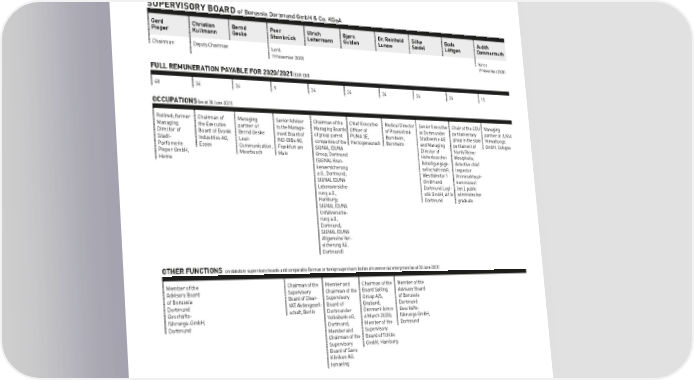ANNUAL FINANCIAL STATEMENTS for the financial year from 1 July 2020 to 30 June 2021 SUPERVISORY BOARD The members of the Company's Supervisory Board waived 33.33% of their Supervisory Board remuneration in financial year 2020/2021. Their names, occupations and their further responsibilities on other management bodies are listed below: SUPERVISORY BOARDof Borussia Dortmund GmbH & Co. KGaA Gerd Christian Bernd Peer Ulrich Bjørn Dr. Reinhold Silke Bodo Judith Pieper Kullmann Geske Steinbrück Leitermann Gulden Lunow Seidel Löttgen Dommermuth Chairman Deputy Chairman (until (since 19 November 2020) 19 November 2020) FULL REMUNERATION PAYABLE FOR 2020/2021(EUR '000) 48 36 24 9 24 24 24 24 24 15 OCCUPATIONS(as at 30 June 2021) Retired; former Chairman of Managing Senior Advisor Chairman of the Chief Executive Medical Director Senior Executive Chair of the CDU Managing Managing the Executive partner of to the Manage- Managing Boards Officer of of Praxisklinik at Dortmunder parliamentary partner of JUVIA Director of Board of Evonik Bernd Geske ment Board of of group parent PUMA SE, Bornheim, Stadtwerke AG group in the state Verwaltungs Stadt- Industries AG, Lean ING-DiBa AG, companies of the Herzogenaurach Bornheim and Managing parliament of GmbH, Cologne Parfümerie Essen Communication, Frankfurt am SIGNAL IDUNA Director of North Rhine- Pieper GmbH, Meerbusch Main Group, Dortmund Hohenbuschei Westphalia, Herne (SIGNAL Kran- Beteiligungsge- detective chief kenversicherung sellschaft mbH, inspector Kriminalhaupt- a.G., Dortmund; Westfalentor 1 ( SIGNAL IDUNA GmbH and kommissar) Lebensversiche- Dortmund Logi- (ret.), public rung a.G., stik GmbH, all in administration Hamburg; Dortmund graduate SIGNAL IDUNA Unfallversiche- rung a.G., Dortmund; SIGNAL IDUNA Allgemeine Ver- sicherung AG, Dortmund) OTHER FUNCTIONS on statutory supervisory boards and comparable German or foreign supervisory bodies of commercial enterprises (as at 30 June 2021) Member of the Chairman of the Member and Chairman of the Member of the Advisory Board Supervisory Chairman of the Board Salling Advisory Board of Borussia Board of Clear- Supervisory Group A/S, of Borussia Dortmund VAT Aktiengesell- Board of Braband, Dortmund Geschäfts- schaft, Berlin Dortmunder Denmark (since Geschäfts- führungs-GmbH, Volksbank eG, 6 March 2020); führungs GmbH, Dortmund Dortmund; Member of the Dortmund Member and Supervisory Chairman of the Board of Tchibo Supervisory GmbH, Hamburg Board of Sana Kliniken AG, Ismaning 105