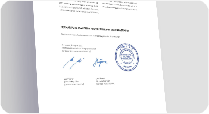 BORUSSIA DORTMUNDGmbH & Co. Kommanditgesellschaft auf Aktien, Dortmund FURTHER INFORMATION PURSUANT TO ARTICLE 10 OF THE EU AUDIT REGULATION We were elected as group auditor at the annual We declare that the opinions expressed in this general meeting on November 19, 2020. We were auditor's report are consistent with the additional engaged by the supervisory board on January 18, report to the audit committee pursuant to Article 11 2021. We have audited Borussia Dortmund GmbH of the EU Audit Regulation (long-form audit report). & Co. Kommanditgesellschaft auf Aktien, Dortmund, without interruption since financial year 2009/2010. GERMAN PUBLIC AUDITOR RESPONSIBLE FOR THE ENGAGEMENT The German Public Auditor responsible for the engagement is Ralph Fischer. Dortmund, 9 August 2021 KPMG AG Wirtschaftsprüfungsgesellschaft [Original German version signed by] gez. Fischer gez. Huperz Wirtschaftsprüfer Wirtschaftsprüfer [German Public Auditor] [German Public Auditor] 116