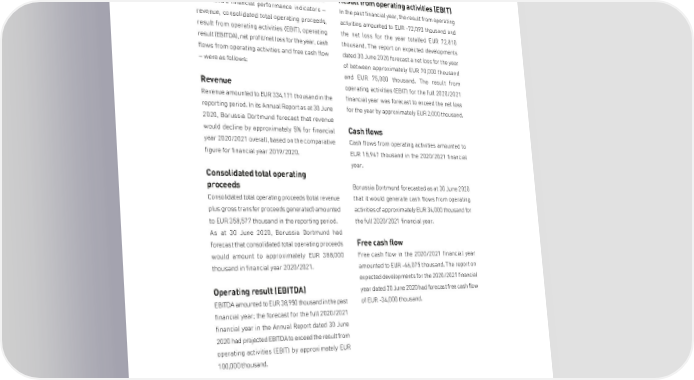 BORUSSIA DORTMUNDGmbH & Co. Kommanditgesellschaft auf Aktien, Dortmund POSITION OF THE COMPANY DEVELOPMENT OF PERFORMANCE INDICATORS Development of financial performance indicators In the 2020/2021 financial year, Borussia Result from operating activities (EBIT) Dortmund's financial performance indicators – In the past financial year, the result from operating revenue, consolidated total operating proceeds, activities amounted to EUR -72,093 thousand and result from operating activities (EBIT), operating the net loss for the year totalled EUR 72,810 result (EBITDA), net profit/net loss for the year, cash thousand. The report on expected developments flows from operating activities and free cash flow dated 30 June 2020 forecast a net loss for the year – were as follows: of between approximately EUR 70,000 thousand and EUR 75,000 thousand. The result from Revenue operating activities (EBIT) for the full 2020/2021 Revenue amounted to EUR 334,171 thousand in the financial year was forecast to exceed the net loss reporting period. In its Annual Report as at 30 June for the year by approximately EUR 2,000 thousand. 2020, Borussia Dortmund forecast that revenue would decline by approximately 5% for financial Cash flows year 2020/2021 overall, based on the comparative Cash flows from operating activities amounted to figure for financial year 2019/2020. EUR 15,947 thousand in the 2020/2021 financial year. Consolidated total operating proceeds Borussia Dortmund forecasted as at 30 June 2020 Consolidated total operating proceeds (total revenue that it would generate cash flows from operating plus gross transfer proceeds generated) amounted activities of approximately EUR 34,000 thousand for to EUR 358,577 thousand in the reporting period. the full 2020/2021 financial year. As at 30 June 2020, Borussia Dortmund had forecast that consolidated total operating proceeds Free cash flow would amount to approximately EUR 388,000 Free cash flow in the 2020/2021 financial year thousand in financial year 2020/2021. amounted to EUR -46,075 thousand. The report on expected developments for the 2020/2021 financial Operating result (EBITDA) year dated 30 June 2020 had forecast free cash flow EBITDA amounted to EUR 38,950 thousand in the past of EUR -34,000 thousand. financial year; the forecast for the full 2020/2021 financial year in the Annual Report dated 30 June 2020 had projected EBITDA to exceed the result from operating activities (EBIT) by approximately EUR 100,000 thousand. 22th match day 23th match day 20 February 2021 27 February 2021 FC Schalke 04 - BVB 0:4 BVB - Arminia Bielefeld 3:0 136