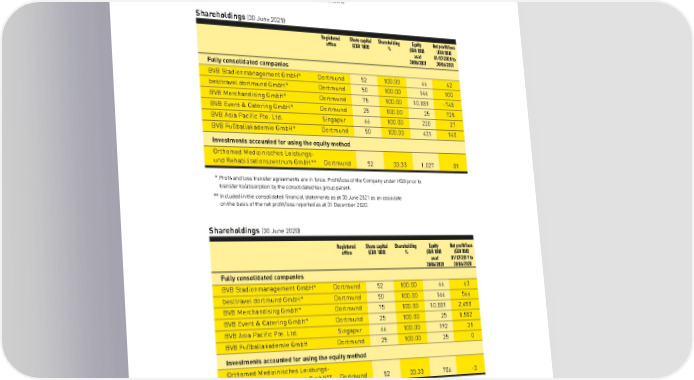 CONSOLIDATED FINANCIAL STATEMENTS for the period from 1 July 2020 to 30 June 2021 Scope of consolidated financial statements In addition to Borussia Dortmund GmbH & Co. KGaA, the consolidated financial statements include six fully consolidated subsidiary companies and one associated company accounted for using the equity method. The list of shareholdings as at 30 June 2021 was as follows: Shareholdings (30 June 2021) Registered Share capital Shareholding Equity Net profit/loss office (EUR '000) % (EUR '000) (EUR'000) as at 01/07/2020 to 30/06/2021 30/06/2021 Fully consolidated companies BVB Stadionmanagement GmbH* Dortmund 52 100.00 66 42 besttravel dortmund GmbH* Dortmund 50 100.00 144 100 BVB Merchandising GmbH* Dortmund 75 100.00 10,881 -748 BVB Event & Catering GmbH* Dortmund 25 100.00 25 725 BVB Asia Pacific Pte. Ltd. Singapur 66 100.00 220 27 BVB Fußballakademie GmbH* Dortmund 50 100.00 431 140 Investments accounted for using the equity method Orthomed Medizinisches Leistungs- und Rehabilitationszentrum GmbH** Dortmund 52 33.33 1,027 81 * Profit and loss transfer agreements are in force. Profit/loss of the Company under HGB prior to transfer to/absorption by the consolidated tax group parent. ** Included in the consolidated financial statements as at 30 June 2021 as an associate on the basis of the net profit/loss reported as at 31 December 2020. Shareholdings (30 June 2020) Registered Share capital Shareholding Equity Net profit/loss office (EUR '000) % (EUR '000) (EUR'000) as at 01/07/2019 to 30/06/2020 30/06/2020 Fully consolidated companies BVB Stadionmanagement GmbH* Dortmund 52 100.00 66 63 besttravel dortmund GmbH* Dortmund 50 100.00 144 566 BVB Merchandising GmbH* Dortmund 75 100.00 10,881 2,458 BVB Event & Catering GmbH* Dortmund 25 100.00 25 1,582 BVB Asia Pacific Pte. Ltd. Singapur 66 100.00 192 31 BVB Fußballakademie GmbH Dortmund 25 100.00 25 0 Investments accounted for using the equity method Orthomed Medizinisches Leistungs- und Rehabilitationszentrum GmbH** Dortmund 52 33.33 786 -3 * Profit and loss transfer agreements are in force. Profit/loss of the Company under HGB prior to transfer to/absorption by the consolidated tax group parent. ** Included in the consolidated financial statements as at 30 June 2020 as an associate on the basis of the net profit/loss reported as at 31 December 2019. No interim financial statements were prepared for Orthomed Medizinisches Leistungs- und Rehabilitationszentrum GmbH (Orthomed GmbH) as at 30 June 2021 due to the fact that there would be no material impact on the consolidated financial statements. Please refer to Note 33 for disclosures on transactions with related parties. 183