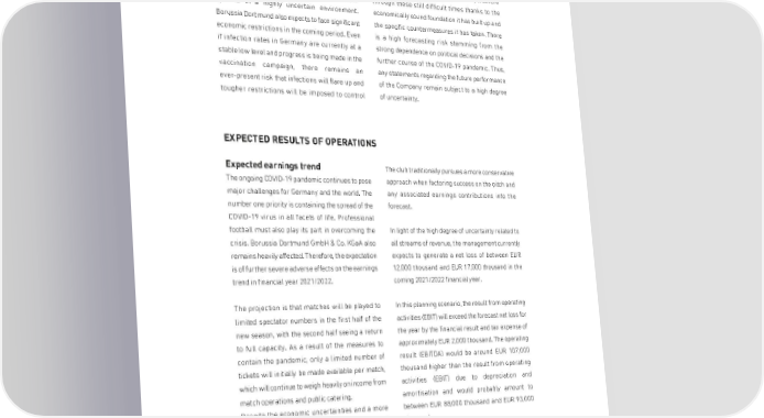 GROUP MANAGEMENT REPORT Overall assessment of expected performance The COVID-19 crisis continues to overshadow the them. This will shape economic planning for some economic activities of German companies, forcing time to come. Borussia Dortmund will persevere them to confront the major challenge of having to through these still difficult times thanks to the operate in a highly uncertain environment. economically sound foundation it has built up and Borussia Dortmund also expects to face significant the specific countermeasures it has taken. There economic restrictions in the coming period. Even is a high forecasting risk stemming from the if infection rates in Germany are currently at a strong dependence on political decisions and the stable low level and progress is being made in the further course of the COVID-19 pandemic. Thus, vaccination campaign, there remains an any statements regarding the future performance ever-present risk that infections will flare up and of the Company remain subject to a high degree tougher restrictions will be imposed to control of uncertainty. EXPECTED RESULTS OF OPERATIONS Expected earnings trend The club traditionally pursues a more conservative The ongoing COVID-19 pandemic continues to pose approach when factoring success on the pitch and major challenges for Germany and the world. The any associated earnings contributions into the number one priority is containing the spread of the forecast. COVID-19 virus in all facets of life. Professional football must also play its part in overcoming the In light of the high degree of uncertainty related to crisis. Borussia Dortmund GmbH & Co. KGaA also all streams of revenue, the management currently remains heavily affected. Therefore, the expectation expects to generate a net loss of between EUR is of further severe adverse effects on the earnings 12,000 thousand and EUR 17,000 thousand in the trend in financial year 2021/2022. coming 2021/2022 financial year. The projection is that matches will be played to In this planning scenario, the result from operating limited spectator numbers in the first half of the activities (EBIT) will exceed the forecast net loss for new season, with the second half seeing a return the year by the financial result and tax expense of to full capacity. As a result of the measures to approximately EUR 2,000 thousand. The operating contain the pandemic, only a limited number of result (EBITDA) would be around EUR 107,000 tickets will initially be made available per match, thousand higher than the result from operating which will continue to weigh heavily on income from activities (EBIT) due to depreciation and match operations and public catering. amortisation and would probably amount to Despite the economic uncertainties and a more between EUR 88,000 thousand and EUR 93,000 subdued transfer market, Borussia Dortmund thousand. expects there to be some very lucrative transfer deals in the offing, setting up net transfer income as a significant earnings driver. 169