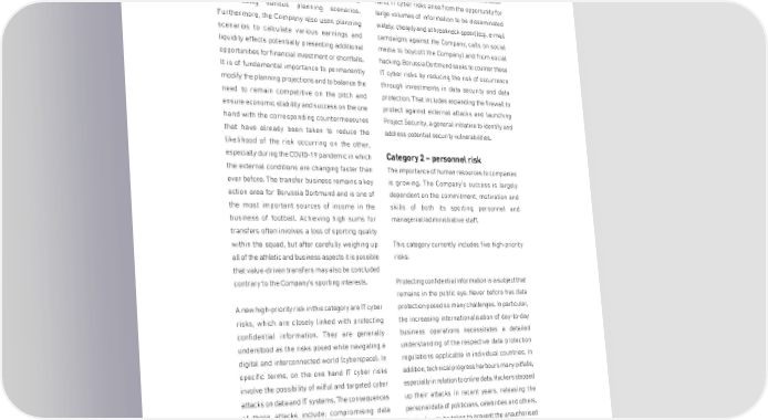 GROUP MANAGEMENT REPORT avoid financial risks that could arise on account of loss of system or data integrity (e.g., data corruption uncertain sporting successes. As in previous years, by means of malware), compromising IT system or Borussia Dortmund further counters this risk by data availability (e.g., internal business interruption, setting strict budgets for the individual divisions outages in external communications). On the other and undertaking corporate planning on a revolving hand, IT cyber risks arise from the opportunity for basis using various planning scenarios. large volumes of information to be disseminated Furthermore, the Company also uses planning widely, cheaply and at breakneck speed (e.g., e-mail scenarios to calculate various earnings and campaigns against the Company, calls on social liquidity effects potentially presenting additional media to boycott the Company) and from social opportunities for financial investment or shortfalls. hacking. Borussia Dortmund seeks to counter these It is of fundamental importance to permanently IT cyber risks by reducing the risk of occurrence modify the planning projections and to balance the through investments in data security and data need to remain competitive on the pitch and protection. That includes expanding the firewall to ensure economic stability and success on the one protect against external attacks and launching hand with the corresponding countermeasures Project Security, a general initiative to identify and that have already been taken to reduce the address potential security vulnerabilities. likelihood of the risk occurring on the other, especially during the COVID-19 pandemic in which Category 2 – personnel risk the external conditions are changing faster than The importance of human resources to companies ever before. The transfer business remains a key is growing. The Company's success is largely action area for Borussia Dortmund and is one of dependent on the commitment, motivation and the most important sources of income in the skills of both its sporting personnel and business of football. Achieving high sums for managerial/administrative staff. transfers often involves a loss of sporting quality within the squad, but after carefully weighing up This category currently includes five high-priority all of the athletic and business aspects it is possible risks: that value-driven transfers may also be concluded contrary to the Company's sporting interests. Protecting confidential information is a subject that remains in the public eye. Never before has data A new high-priority risk in this category are IT cyber protection posed so many challenges. In particular, risks, which are closely linked with protecting the increasing internationalisation of day-to-day confidential information. They are generally business operations necessitates a detailed understood as the risks posed while navigating a understanding of the respective data protection digital and interconnected world (cyberspace). In regulations applicable in individual countries. In specific terms, on the one hand IT cyber risks addition, technical progress harbours many pitfalls, involve the possibility of wilful and targeted cyber especially in relation to online data. Hackers stepped attacks on data and IT systems. The consequences up their attacks in recent years, releasing the of these attacks include: compromising data personal data of politicians, celebrities and others. confidentiality (e.g., data losses, data espionage), Action has to be taken to prevent the unauthorised 157