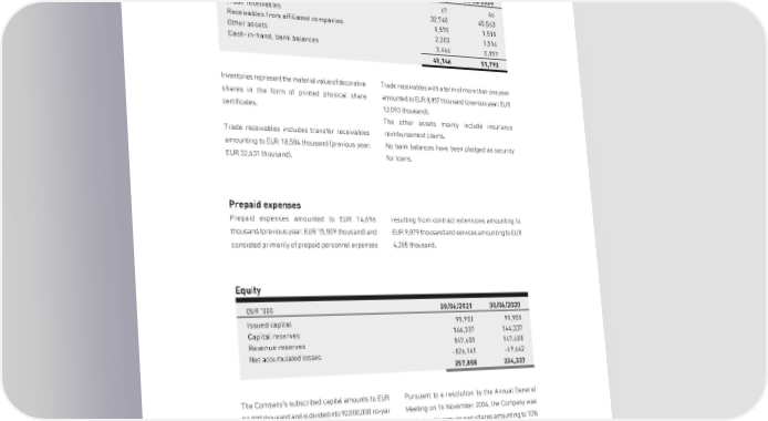 BORUSSIA DORTMUNDGmbH & Co. Kommanditgesellschaft auf Aktien, Dortmund Current assets Current assets are made up as follows: EUR '000 30/06/2021 30/06/2020 Inventories 67 46 Trade receivables 32,740 45,563 Receivables from affiliated companies 1,570 1,511 Other assets 2,303 1,516 Cash-in-hand, bank balances 3,466 3,157 40,146 51,793 Inventories represent the material value of decorative Trade receivables with a term of more than one year shares in the form of printed physical share amounted to EUR 8,857 thousand (previous year: EUR certificates. 12,093 thousand). The other assets mainly include insurance Trade receivables includes transfer receivables reimbursement claims. amounting to EUR 18,584 thousand (previous year: No bank balances have been pledged as security EUR 32,631 thousand). for loans. Prepaid expenses Prepaid expenses amounted to EUR 14,696 resulting from contract extensions amounting to thousand (previous year: EUR 15,509 thousand) and EUR 9,879 thousand and services amounting to EUR consisted primarily of prepaid personnel expenses 4,285 thousand. Equity EUR '000 30/06/2021 30/06/2020 Issued capital 91,981 91,981 Capital reserves 144,337 144,337 Revenue reserves 147,681 147,681 Net accumulated losses -126,141 -49,662 257,858 334,337 The Company's subscribed capital amounts to EUR Pursuant to a resolution by the Annual General 92,000 thousand and is divided into 92,000,000 no-par Meeting on 16 November 2004, the Company was value shares, each representing a notional share in authorised to acquire own shares amounting to 10% the share capital of EUR 1.00, less the notional value of the share capital on or before 30 April 2006. The of treasury shares of EUR 19 thousand. Equity Company was also authorised to sell its treasury contains a presentation of treasury shares in which shares either on or off the stock market. Off-market the nominal amount of the treasury shares is sales are permitted, among other purposes, for the deducted from equity under subscribed capital on the sale of shares in the form of printed physical share face of the balance sheet. Furthermore, a reserve for certificates which are freely transferable and treasury shares in the same amount is also presented. tradable. In such cases, shareholders' subscription 96