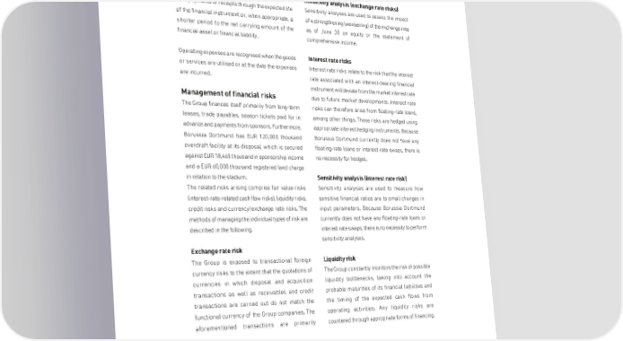 CONSOLIDATED FINANCIAL STATEMENTS for the period from 1 July 2020 to 30 June 2021 Interest income and expenses are allocated to the conducted on the basis of euros (EUR) and pounds period to which they relate, taking into account the sterling (GBP). Currency forwards are concluded to outstanding amount of the loan and the effective hedge the cash flows. interest rate to be applied. The effective interest rate is the rate that exactly discounts estimated future Sensitivity analysis (exchange rate risks) cash payments or receipts through the expected life Sensitivity analyses are used to assess the impact of the financial instrument or, when appropriate, a of a strengthening (weakening) of the exchange rate shorter period to the net carrying amount of the as of June 30 on equity or the statement of financial asset or financial liability. comprehensive income. Operating expenses are recognised when the goods Interest rate risks or services are utilised or at the date the expenses Interest rate risks relate to the risk that the interest are incurred. rate associated with an interest-bearing financial instrument will deviate from the market interest rate Management of financial risks due to future market developments. Interest rate The Group finances itself primarily from long-term risks can therefore arise from floating-rate loans, leases, trade payables, season tickets paid for in among other things. These risks are hedged using advance and payments from sponsors. Furthermore, appropriate interest hedging instruments. Because Borussia Dortmund has EUR 120,000 thousand Borussia Dortmund currently does not have any overdraft facility at its disposal, which is secured floating-rate loans or interest rate swaps, there is against EUR 18,465 thousand in sponsorship income no necessity for hedges. and a EUR 60,000 thousand registered land charge in relation to the stadium. Sensitivity analysis (interest rate risk) The related risks arising comprise fair value risks Sensitivity analyses are used to measure how (interest-rate-related cash flow risks), liquidity risks, sensitive financial ratios are to small changes in credit risks and currency/exchange rate risks. The input parameters. Because Borussia Dortmund methods of managing the individual types of risk are currently does not have any floating-rate loans or described in the following. interest rate swaps, there is no necessity to perform sensitivity analyses. Exchange rate risk The Group is exposed to transactional foreign Liquidity risk currency risks to the extent that the quotations of The Group constantly monitors the risk of possible currencies in which disposal and acquisition liquidity bottlenecks, taking into account the transactions as well as receivables and credit probable maturities of its financial liabilities and transactions are carried out do not match the the timing of the expected cash flows from functional currency of the Group companies. The operating activities. Any liquidity risks are aforementioned transactions are primarily countered through appropriate forms of financing. 191