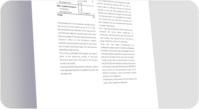 MANAGEMENT REPORT Example Categorisation of risks Before countermeasures: In accordance with the recommendations under Probability 2 2+3=5 5 German Accounting Standard DRS 20, and to Consequences 3 ensure ease of reference, Borussia Dortmund After countermeasures: divides its risks into main categories. The nine Probability 1 defined main categories (strategic risk, personnel Consequences 2 (1+2)x2=6 6 risk, macroeconomic risk, competitive risk, liquidity TOTAL 11 risk, interest rate risk, credit risk, resources risk and ecological risk) are presented and explained in greater detail below. If the assessment of an individual risk falls within the top third of the scale (a score of 17 to 24), All 61 risks that could have a direct impact on the Borussia Dortmund classifies it as a high-priority Company fall within these categories. In risk. Particular attention is paid to such risks, since comparison with the previous year (62 risks), the they are capable of having a material adverse and total number was reduced by one risk that no long-term effect on the Company's assets, longer meets the criterion of materiality. liabilities, financial position and profit or loss. There Three new risks (legal transgressions by are currently 26 (previous year: 23) risks that are professional players, lack of transfers/willingness classified as high priority. to transfer, and IT cyber risks) were added to the 23 The currency and detail of the regular risk reports risks that had been classified as high-priority in the given to the governing bodies of Borussia past period. No high-priority risks were removed. Dortmund keep them informed of the Group's Further to the notes on opportunities and risks in current risk profile. the 2019/2020 Annual Report, the focus during the This ensures that the Company's decision-makers current reporting period (financial year 2020/2021) have adequate flexibility to be able to monitor and was primarily on the persistent impact of the manage risks. COVID-19 pandemic, which continues to impact almost all risk categories. The following is a discussion of the 26 high-priority risks in their respective categories. 67
