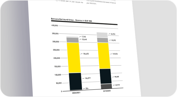 GROUP MANAGEMENT REPORT REVENUE TREND Borussia Dortmund generated revenue of EUR severe restrictions as a result of the COVID-19 334,171 thousand in the 2020/2021 financial year, pandemic. By contrast, income from match representing a decrease of EUR 36,025 thousand operations, merchandising, and conference, or 9.73%. Income from advertising and TV catering and miscellaneous decreased in financial marketing increased year on year despite the year 2020/2021. Borussia Dortmund Group– Revenue in EUR '000 400,000 36,553 350,000 7,745 32,640 33,292 300,000 250,000 186,655 169,836 200,000 150,000 100,000 106,577 98,005 50,000 32,510 0 554 2020/2021 2019/2020 Conference, catering, miscellaneous TV Marketing Match operations Merchandising Advertising Quarter final, second leg UCL 29th match day 14 April 2021 18 April 2021 BVB - Manchester City 1:2 BVB - Werder Bremen 4:1 141