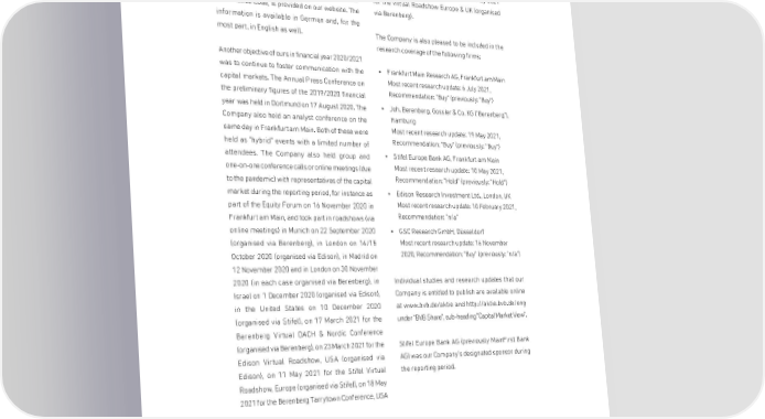 THE SHARES in-depth information on implementing the (organised via Berenberg), and on 26/27 May 2021 recommendations of the German Corporate for the virtual Roadshow Europe & UK (organised Governance Code, is provided on our website. The via Berenberg). information is available in German and, for the most part, in English as well. The Company is also pleased to be included in the research coverage of the following firms: Another objective of ours in financial year 2020/2021 was to continue to foster communication with the • Frankfurt Main Research AG, Frankfurt am Main capital markets. The Annual Press Conference on Most recent research update: 6 July 2021, the preliminary figures of the 2019/2020 financial Recommendation: "Buy" (previously: "Buy") year was held in Dortmund on 17 August 2020. The • Joh. Berenberg, Gossler & Co. KG ("Berenberg"), Company also held an analyst conference on the Hamburg same day in Frankfurt am Main. Both of these were Most recent research update: 19 May 2021, held as "hybrid" events with a limited number of Recommendation: "Buy" (previously: "Buy") attendees. The Company also held group and • Stifel Europe Bank AG, Frankfurt am Main one-on-one conference calls or online meetings (due Most recent research update: 10 May 2021, to the pandemic) with representatives of the capital Recommendation: "Hold" (previously: "Hold") market during the reporting period, for instance as • Edison Research Investment Ltd., London, UK part of the Equity Forum on 16 November 2020 in Most recent research update: 10 February 2021, Frankfurt am Main, and took part in roadshows (via Recommendation: "n/a" online meetings) in Munich on 22 September 2020 • GSC Research GmbH, Düsseldorf (organised via Berenberg), in London on 14/15 Most recent research update: 16 November October 2020 (organised via Edison), in Madrid on 2020, Recommendation: "Buy" (previously: "n/a") 12 November 2020 and in London on 30 November 2020 (in each case organised via Berenberg), in Individual studies and research updates that our Israel on 1 December 2020 (organised via Edison), Company is entitled to publish are available online in the United States on 10 December 2020 at www.bvb.de/aktie and http://aktie.bvb.de/eng (organised via Stifel), on 17 March 2021 for the under "BVB Share", sub-heading "Capital Market View". Berenberg Virtual DACH & Nordic Conference (organised via Berenberg), on 23 March 2021 for the Stifel Europe Bank AG (previously MainFirst Bank Edison Virtual Roadshow, USA (organised via AG) was our Company's designated sponsor during Edison), on 11 May 2021 for the Stifel Virtual the reporting period. Roadshow, Europe (organised via Stifel), on 18 May 2021 for the Berenberg Tarrytown Conference, USA 21
