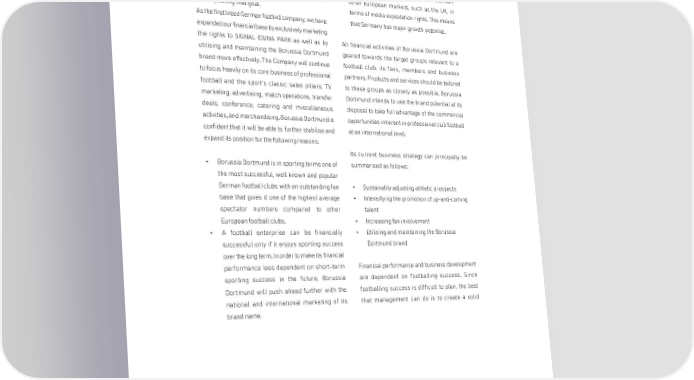 BORUSSIA DORTMUNDGmbH & Co. Kommanditgesellschaft auf Aktien, Dortmund CORPORATE STRATEGY Borussia Dortmund pursues the objective of • Germany continues to be one of Europe's largest defending its position in the top flight of the football markets, although it lags behind certain Bundesliga and sees itself well on the way to other European markets, such as the UK, in accomplishing that goal. terms of media exploitation rights. This means As the first listed German football company, we have that Germany has major growth potential. expanded our financial base by exclusively marketing the rights to SIGNAL IDUNA PARK as well as by All financial activities of Borussia Dortmund are utilising and maintaining the Borussia Dortmund geared towards the target groups relevant to a brand more effectively. The Company will continue football club: its fans, members and business to focus heavily on its core business of professional partners. Products and services should be tailored football and the sport's classic sales pillars: TV to these groups as closely as possible. Borussia marketing, advertising, match operations, transfer Dortmund intends to use the brand potential at its deals, conference, catering and miscellaneous disposal to take full advantage of the commercial activities, and merchandising. Borussia Dortmund is opportunities inherent in professional club football confident that it will be able to further stabilise and at an international level. expand its position for the following reasons: Its current business strategy can principally be • Borussia Dortmund is in sporting terms one of summarised as follows: the most successful, well known and popular German football clubs with an outstanding fan • Sustainably adjusting athletic prospects base that gives it one of the highest average • Intensifying the promotion of up-and-coming spectator numbers compared to other talent European football clubs. • Increasing fan involvement • A football enterprise can be financially • Utilising and maintaining the Borussia successful only if it enjoys sporting success Dortmund brand over the long term. In order to make its financial performance less dependent on short-term Financial performance and business development sporting success in the future, Borussia are dependent on footballing success. Since Dortmund will push ahead further with the footballing success is difficult to plan, the best national and international marketing of its that management can do is to create a solid brand name. 46