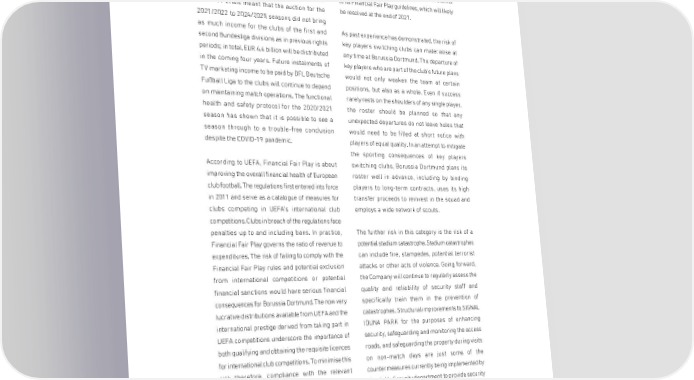 MANAGEMENT REPORT The second risk classified as high-priority in this already been disciplined and banned from category is the change in income from TV international competitions for violating Financial marketing. After DFL Deutsche Fußball Liga's Fair Play rules. In the wake of the COVID-19 crisis, auctions for TV rights led to a steady rise in UEFA is currently consulting on potential reforms income from TV marketing in recent years, the to its Financial Fair Play guidelines, which will likely COVID-19 crisis meant that the auction for the be resolved at the end of 2021. 2021/2022 to 2024/2025 seasons did not bring as much income for the clubs of the first and As past experience has demonstrated, the risk of second Bundesliga divisions as in previous rights key players switching clubs can materialise at periods; in total, EUR 4.4 billion will be distributed any time at Borussia Dortmund. The departure of in the coming four years. Future instalments of key players who are part of the club's future plans TV marketing income to be paid by DFL Deutsche would not only weaken the team at certain Fußball Liga to the clubs will continue to depend positions, but also as a whole. Even if success on maintaining match operations. The functional rarely rests on the shoulders of any single player, health and safety protocol for the 2020/2021 the roster should be planned so that any season has shown that it is possible to see a unexpected departures do not leave holes that season through to a trouble-free conclusion would need to be filled at short notice with despite the COVID-19 pandemic. players of equal quality. In an attempt to mitigate the sporting consequences of key players According to UEFA, Financial Fair Play is about switching clubs, Borussia Dortmund plans its improving the overall financial health of European roster well in advance, including by binding club football. The regulations first entered into force players to long-term contracts, uses its high in 2011 and serve as a catalogue of measures for transfer proceeds to reinvest in the squad and clubs competing in UEFA's international club employs a wide network of scouts. competitions. Clubs in breach of the regulations face penalties up to and including bans. In practice, The further risk in this category is the risk of a Financial Fair Play governs the ratio of revenue to potential stadium catastrophe. Stadium catastrophes expenditures. The risk of failing to comply with the can include fire, stampedes, potential terrorist Financial Fair Play rules and potential exclusion attacks or other acts of violence. Going forward, from international competitions or potential the Company will continue to regularly assess the financial sanctions would have serious financial quality and reliability of security staff and consequences for Borussia Dortmund. The now very specifically train them in the prevention of lucrative distributions available from UEFA and the catastrophes. Structural improvements to SIGNAL international prestige derived from taking part in IDUNA PARK for the purposes of enhancing UEFA competitions underscore the importance of security, safeguarding and monitoring the access both qualifying and obtaining the requisite licences roads, and safeguarding the property during visits for international club competitions. To minimise this on non-match days are just some of the risk therefore, compliance with the relevant countermeasures currently being implemented by requirements and target/actual comparisons are the club's Security department to provide security constantly reviewed. Several European clubs have at the stadium. 73