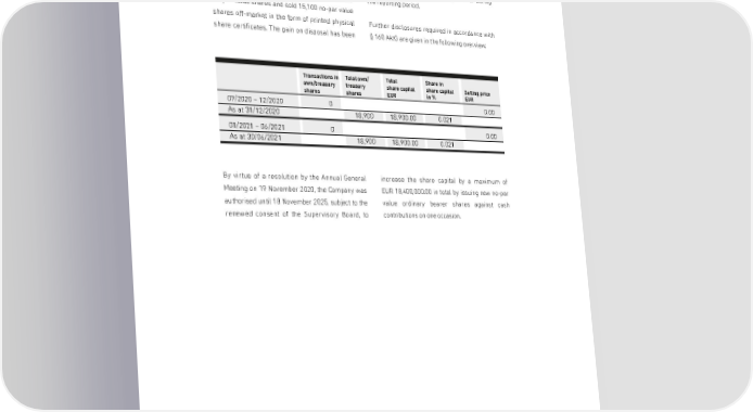 ANNUAL FINANCIAL STATEMENTS for the financial year from 1 July 2020 to 30 June 2021 rights are excluded in accordance with § 71 (1) No.8 reported separately under other operating income. AktG. In the period between the date of admission At the balance sheet date, the Company's holding of the Company's shares to trading (31 October of its own securities consisted of 18,900 no-par 2000) and the end of the reporting period (30 June value shares; no shares were disposed of during 2021), the Company acquired a total of 34,000 the reporting period. no-par value shares and sold 15,100 no-par value shares off-market in the form of printed physical Further disclosures required in accordance with share certificates. The gain on disposal has been §160 AktG are given in the following overview: Transactions in Total own/ Total Share in own/treasury treasury share capital share capital Selling price shares shares EUR in % EUR 07/2020 – 12/2020 0 0.00 As at 31/12/2020 18,900 18,900.00 0.021 01/2021 – 06/2021 0 0.00 As at 30/06/2021 18,900 18,900.00 0.021 By virtue of a resolution by the Annual General increase the share capital by a maximum of Meeting on 19 November 2020, the Company was EUR18,400,000.00 in total by issuing new no-par authorised until 18 November 2025, subject to the value ordinary bearer shares against cash renewed consent of the Supervisory Board, to contributions on one occasion. 97