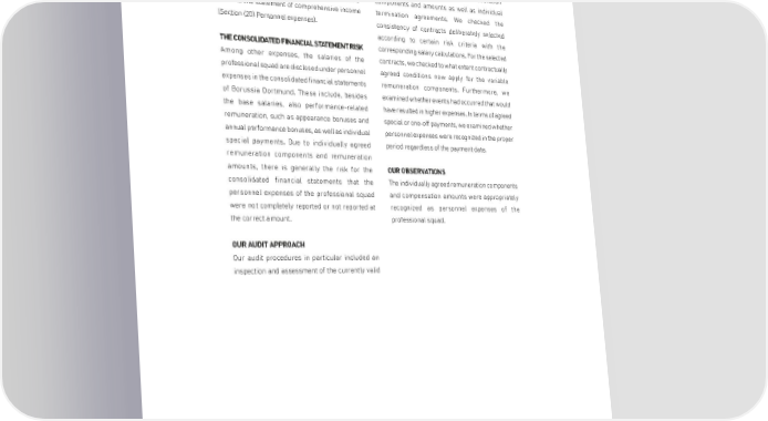 CONSOLIDATED FINANCIAL STATEMENTS for the period from 1 July 2020 to 30 June 2021 Completeness and accuracy of personnel expenses of the professional squad We refer to the information in the notes to the employment contracts with their remuneration consolidated financial statements under explanatory components and amounts as well as individual notes to the statement of comprehensive income termination agreements. We checked the (Section (20) Personnel expenses). consistency of contracts deliberately selected according to certain risk criteria with the THE CONSOLIDATED FINANCIAL STATEMENT RISK corresponding salary calculations. For the selected Among other expenses, the salaries of the contracts, we checked to what extent contractually professional squad are disclosed under personnel agreed conditions now apply for the variable expenses in the consolidated financial statements remuneration components. Furthermore, we of Borussia Dortmund. These include, besides examined whether events had occurred that would the base salaries, also performance-related have resulted in higher expenses. In terms of agreed remuneration, such as appearance bonuses and special or one-off payments, we examined whether annual performance bonuses, as well as individual personnel expenses were recognized in the proper special payments. Due to individually agreed period regardless of the payment date. remuneration components and remuneration amounts, there is generally the risk for the OUR OBSERVATIONS consolidated financial statements that the The individually agreed remuneration components personnel expenses of the professional squad and compensation amounts were appropriately were not completely reported or not reported at recognized as personnel expenses of the the correct amount. professional squad. OUR AUDIT APPROACH Our audit procedures in particular included an inspection and assessment of the currently valid 227