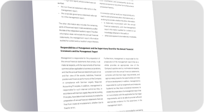 BORUSSIA DORTMUNDGmbH & Co. Kommanditgesellschaft auf Aktien, Dortmund Other information Management and/or the Supervisory Board are/is Our opinions on the annual financial statements responsible for the other information. The other and on the management report do not cover the information comprises the following components other information, and consequently we do not of the management report, whose content was not express an opinion or any other form of assurance audited: conclusion thereon. – the non-financial statement referred to in the management report, In connection with our audit, our responsibility is to – the corporate governance statement referred read the aforementioned other information and, in to in the management report, so doing, to consider whether the other information – is materially inconsistent with the annual The other information also includes the remaining financial statements, with the management parts of the annual report made available to us after report information audited for content or our the date of the independent auditor's report. The other knowledge obtained in the audit, or information does not include the annual financial – otherwise appears to be materially misstated. statements, the management report information audited for content and our auditor's report thereon. Responsibilities of Management and the Supervisory Board for the Annual Financial Statements and the Management Report Management is responsible for the preparation of Furthermore, management is responsible for the the annual financial statements that comply, in all preparation of the management report that as a material respects, with the requirements of German whole provides an appropriate view of the commercial law applicable to business corporations, Company's position and is, in all material respects, and that the annual financial statements give a true consistent with the annual financial statements, and fair view of the assets, liabilities, financial complies with German legal requirements, and position and financial performance of the Company appropriately presents the opportunities and risks in compliance with German Legally Required of future development. In addtion, management is Accounting Principles. In addition, management is responsible for such arrangements and measures responsible for such internal control as they, in (systems) as they have considered necessary to accordance with German Legally Required Accounting enable the preparation of a management report that Principles, have determined necessary to enable the is in accordance with the applicable German legal preparation of annual financial statements that are requirements, and to be able to provide sufficient free from material misstatement, whether due to appropriate evidence for the assertions in the fraud or error. management report. In preparing the annual financial statements, The supervisory board is responsible for overseeing management is responsible for assessing the the Company's financial reporting process for the Company's ability to continue as a going concern. They preparation of the annual financial statements and also have the responsibility for disclosing, as applicable, of the management report. matters related to going concern. In addition, they are responsible for financial reporting based on the going concern basis of accounting, provided no actual or legal circumstances conflict therewith. 112