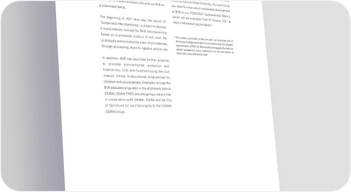 GROUP MANAGEMENT REPORT The tickets had previously only been valid within During the pandemic, BVB has opted not to reduce the VRR transport authority region. Borussia its employees' working hours and, during the Dortmund is also helping make employees' daily lockdowns, provided job rotation opportunities commute more environmentally friendly by within its various fields of activity. You can find all offering the chance to lease a bicycle via BVB on you need to know about sustainable development a subsidised basis. at BVB in our 2020/2021 Sustainability Report, which will be available from 29 October 2021 at The beginning of 2021 also saw the launch of https://verantwortung.bvb.de/en.* "Sustainable Merchandising", a project to develop a sustainability concept for BVB merchandising based on a prototype product. It will cover the * The content accessible via the link does not constitute part of this Group management report. In accordance with the statutory prototype's entire production chain, from materials, requirements, KPMG AG Wirtschaftsprüfungsgesellschaft has through processing, down to logistics and re-use. neither audited the cross-references nor the information to which the cross-references refer. In addition, BVB has launched further projects to promote environmental protection and biodiversity, first and foremost using the club mascot, Emma, in educational programmes for children and young people. Examples include the BVB educational garden in the allotments behind SIGNAL IDUNA PARK and designing a nature trail in cooperation with SIGNAL IDUNA and the City of Dortmund on land belonging to the SIGNAL IDUNA Group. 26th match day 27th match day 20 March 2021 3 April 2021 1. FC Köln - BVB 2:2 BVB - Eintracht Frankfurt 1:2 139